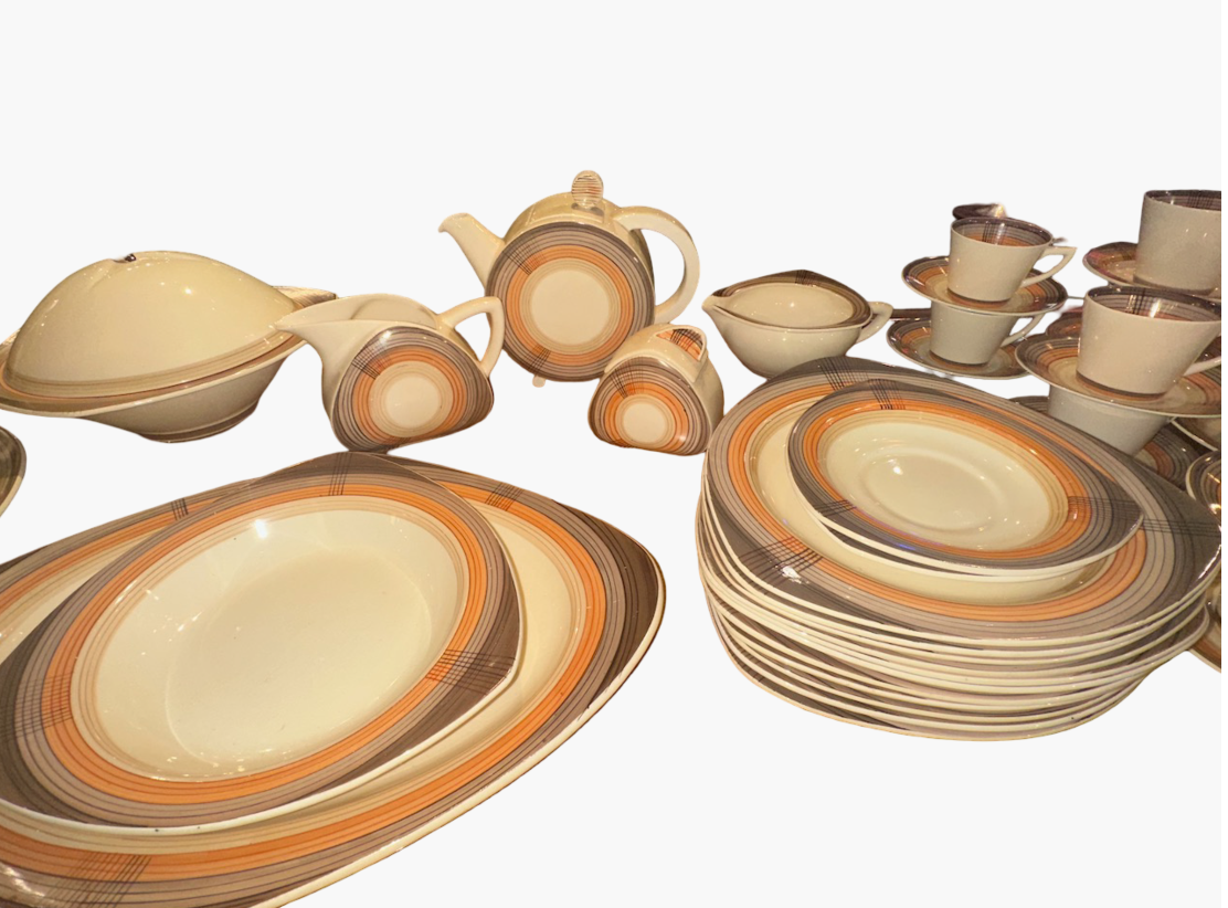 Art Deco Tea Set Dynamic Design by Eva Zeisel-Art Deco Collection A rare 33-piece tea set designed by Eva Zeisel, featuring striking hand-painted geometric motifs...