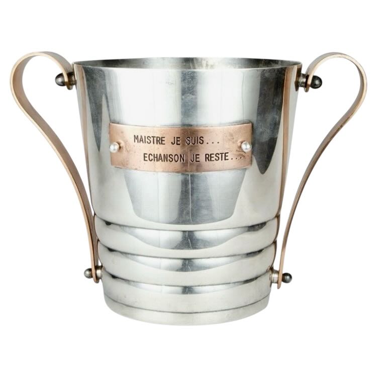 French Art Deco Champagne Bucket with Inscription This elegant French Art Deco champagne bucket is crafted in silvered metal with gracefully curved copper handles and...