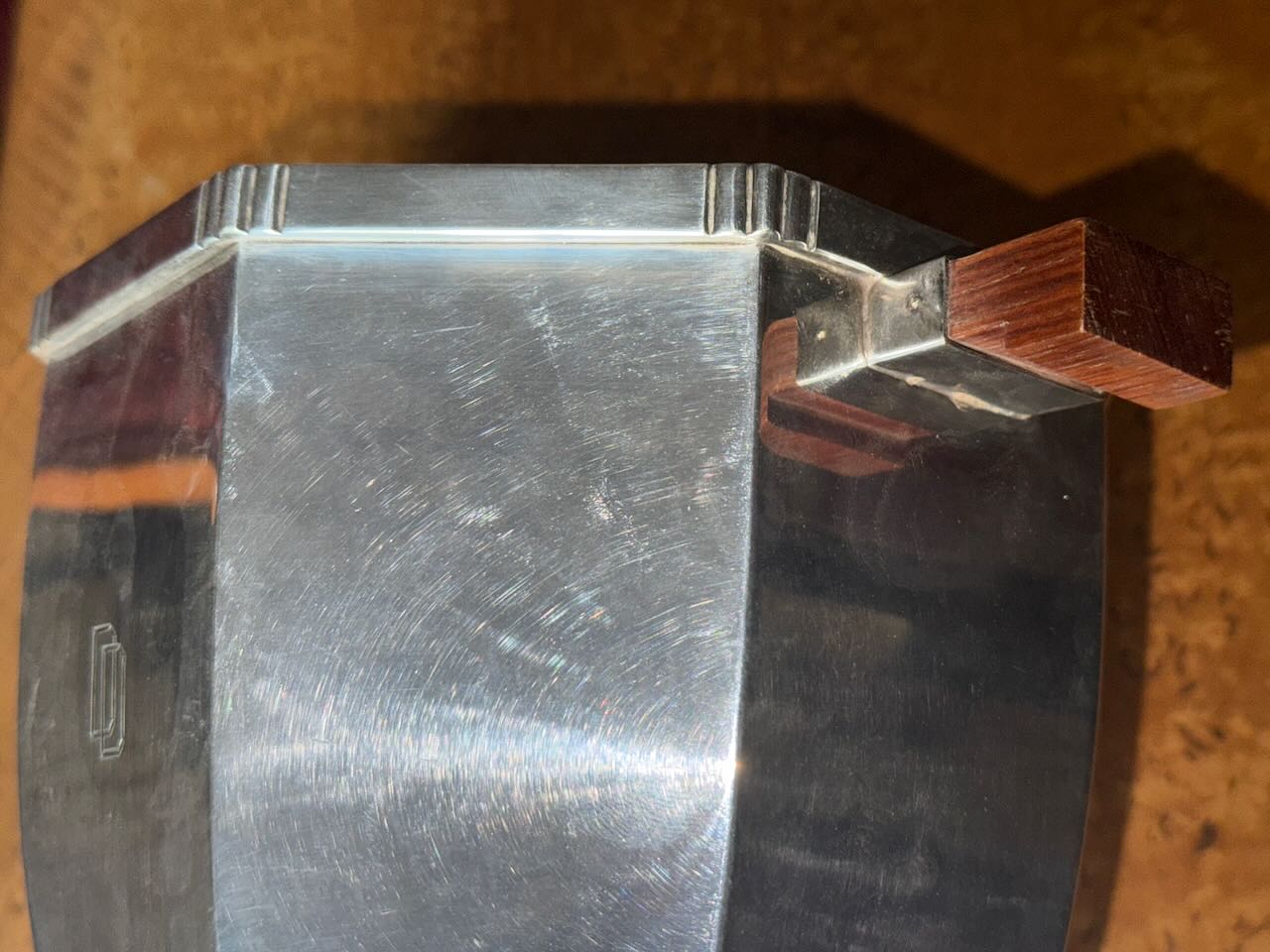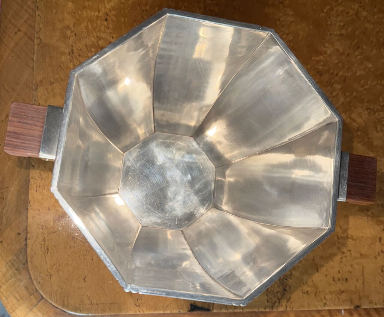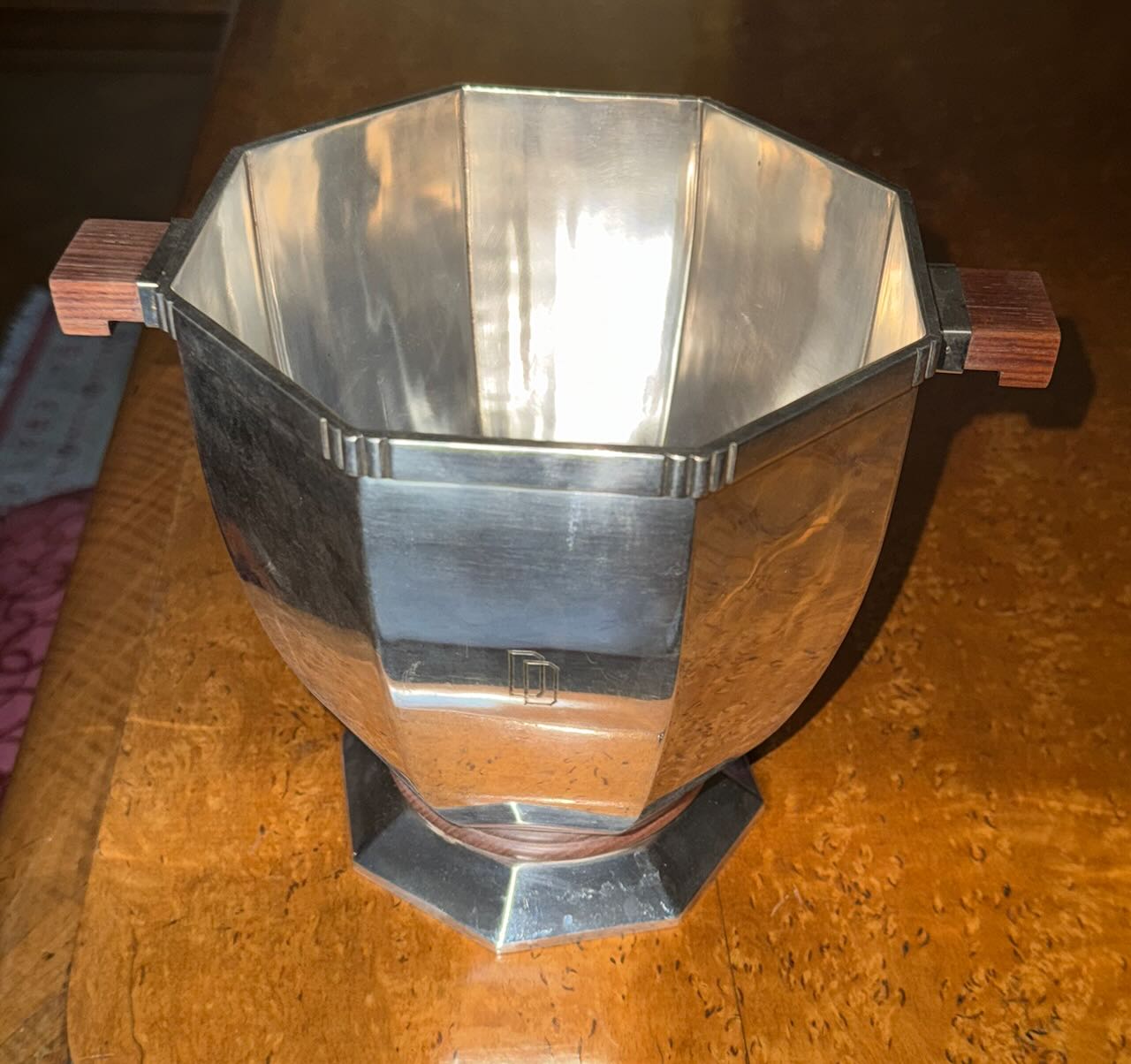 A striking Art Deco wine or champagne cooler by Christofle, part of their renowned Gallia collection, France, circa 1930. This octagonal silver-plated form exemplifies the geometric precision and modernist sensibility of the period, balanced with subtle warmth through its sculpted wood handles and matching wood base trim.