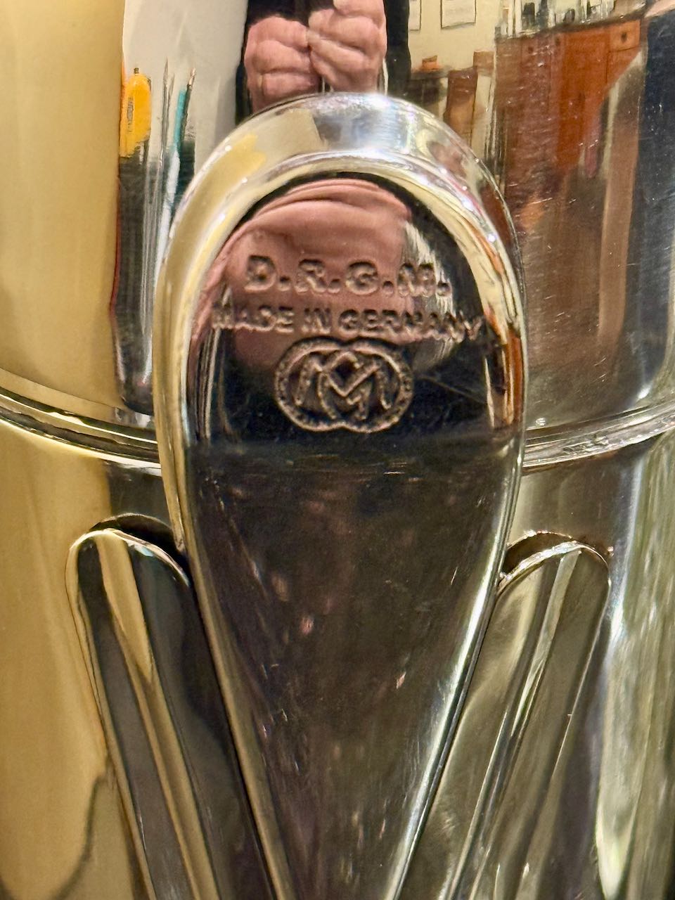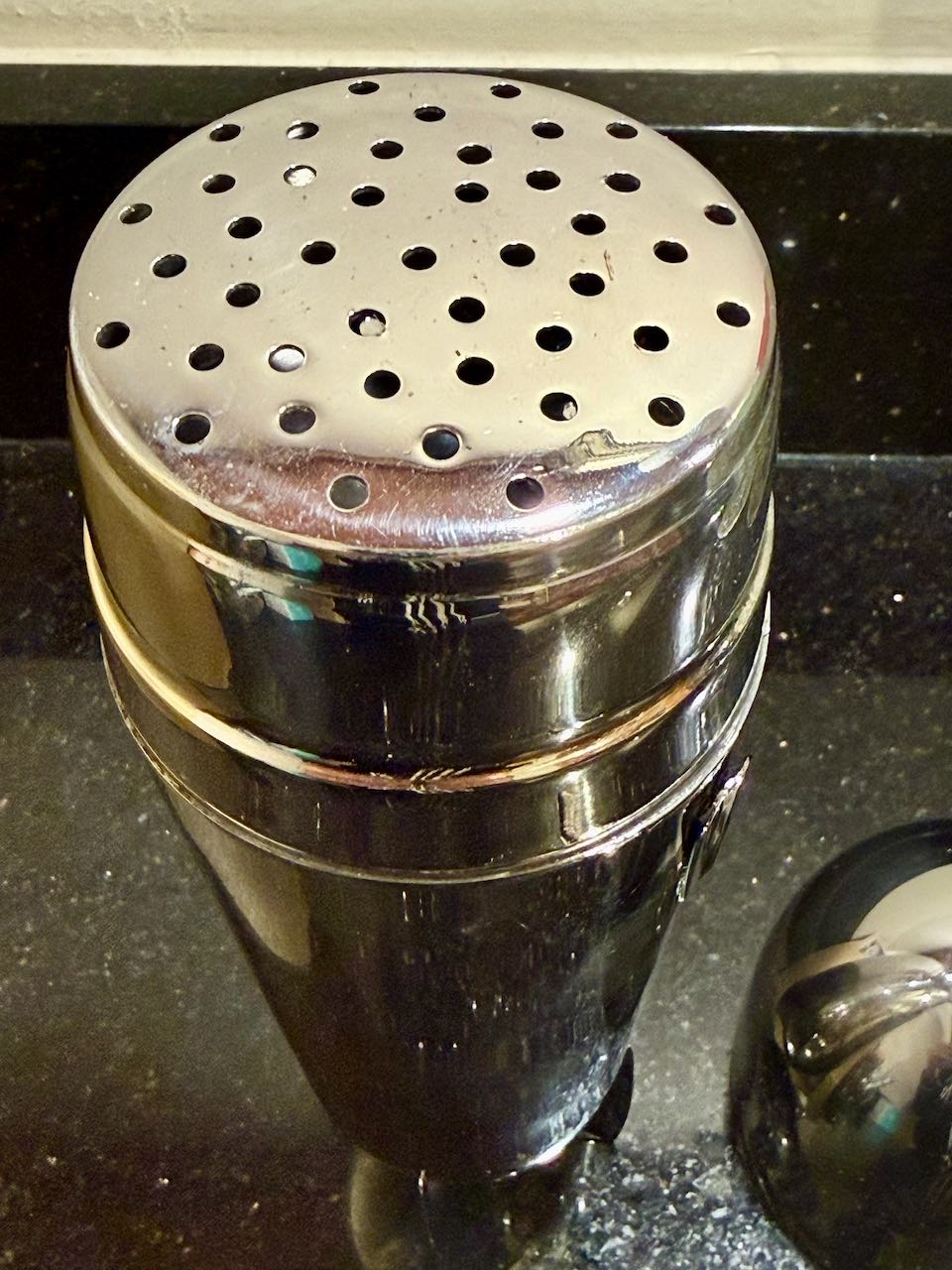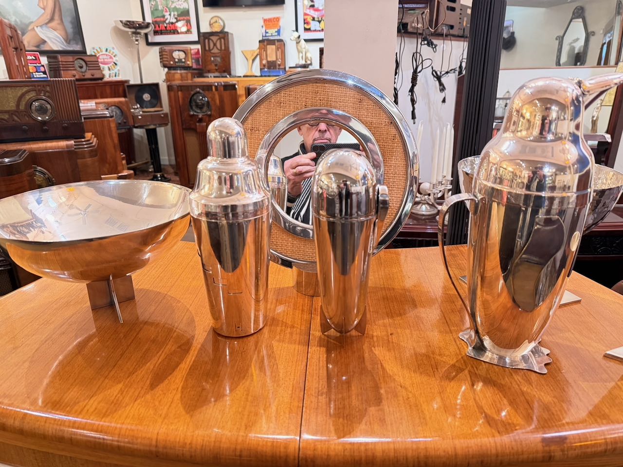 Inside this original shaker is the full configuration of parts that separate and nest perfectly. Included are four graduated cups, a strainer with a cap, a decanter with a cover, a funnel with a combined stopper and corkscrew, and a holder designed for a bar spoon or to keep it all together. This example has all pieces present and displays a wonderful period interior with the expected gilt wash inside the shaker body. Few surviving Zeppelin Form sets remain intact, making this an important and rare object for anyone collecting serious Art Deco barware, German design, or early aviation-inspired metalwork of the late 1920s.