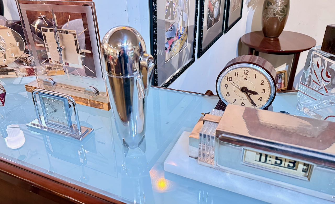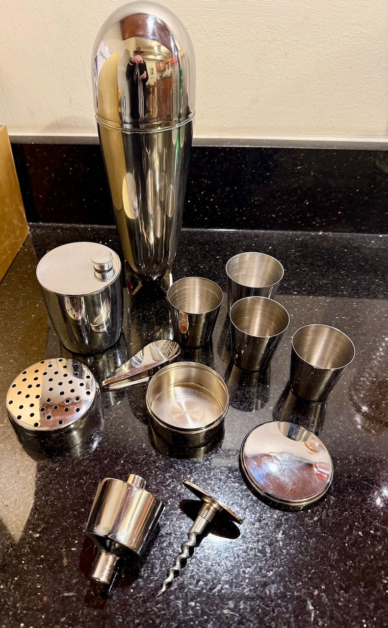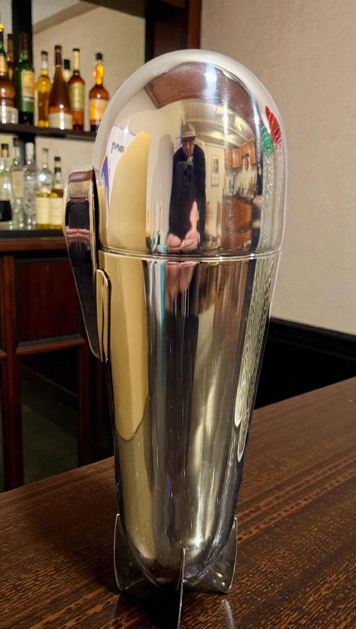 Inside this original shaker is the full configuration of parts that separate and nest perfectly. Included are four graduated cups, a strainer with a cap, a decanter with a cover, a funnel with a combined stopper and corkscrew, and a holder designed for a bar spoon or to keep it all together. This example has all pieces present and displays a wonderful period interior with the expected gilt wash inside the shaker body. Few surviving Zeppelin Form sets remain intact, making this an important and rare object for anyone collecting serious Art Deco barware, German design, or early aviation-inspired metalwork of the late 1920s.