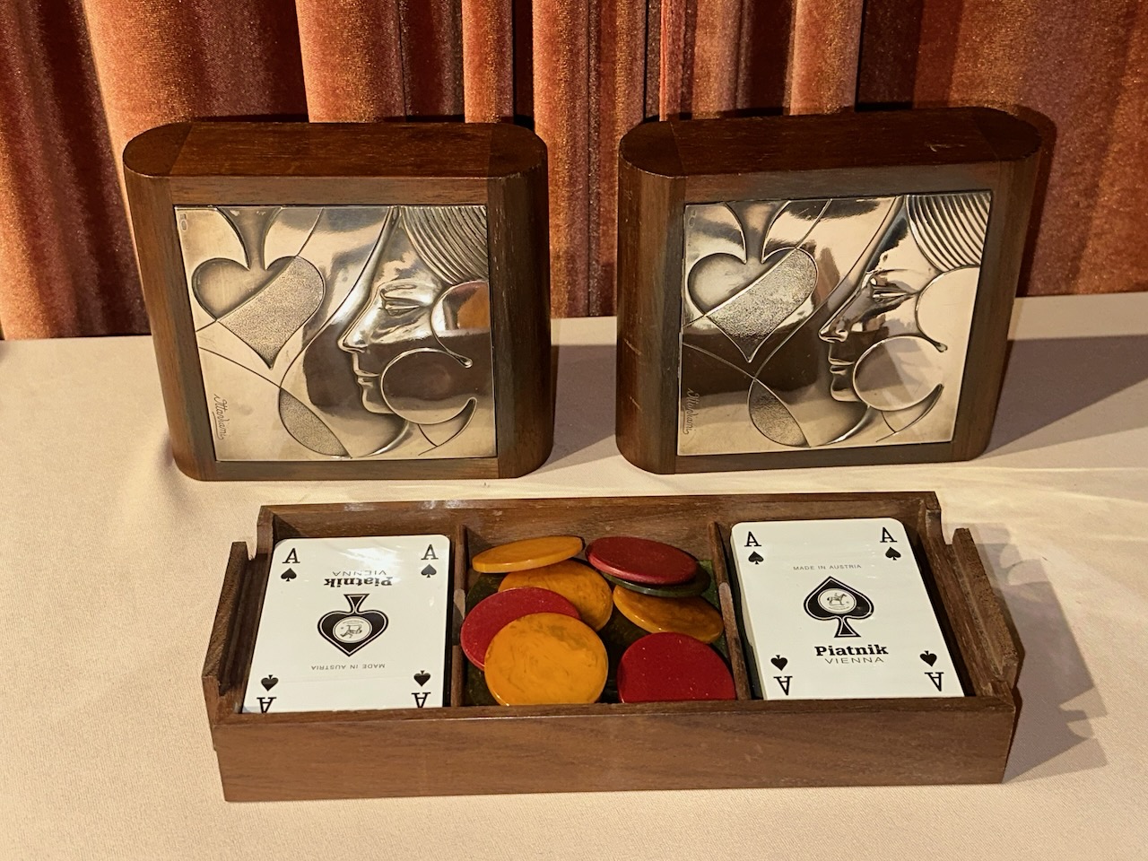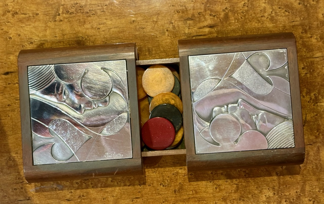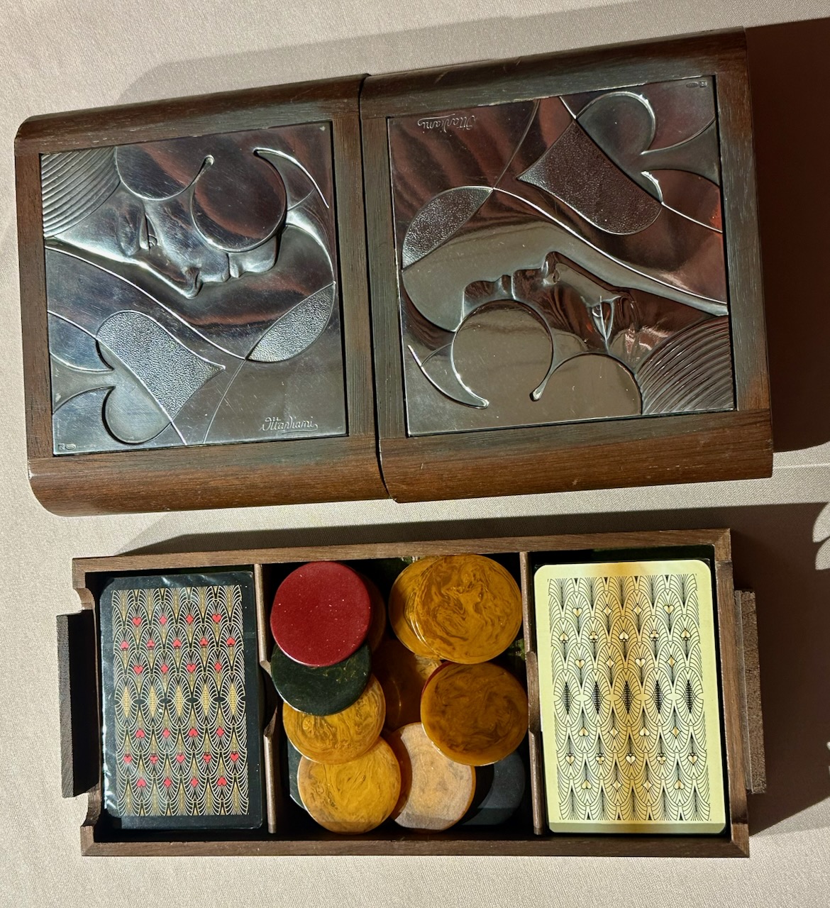 The silver panels are impressed with the number 925 and the Italian maker’s marks, Ottaviani was well known for their refined metalwork and for combining silver with fine exotic woods. Authentic bakelite gambling chips have been included in the center compartment and the playing cards are a special set made in Vienna.