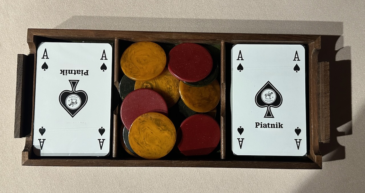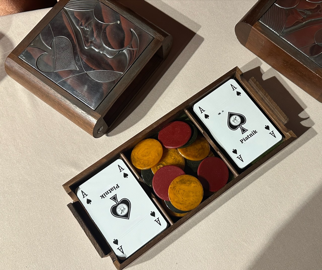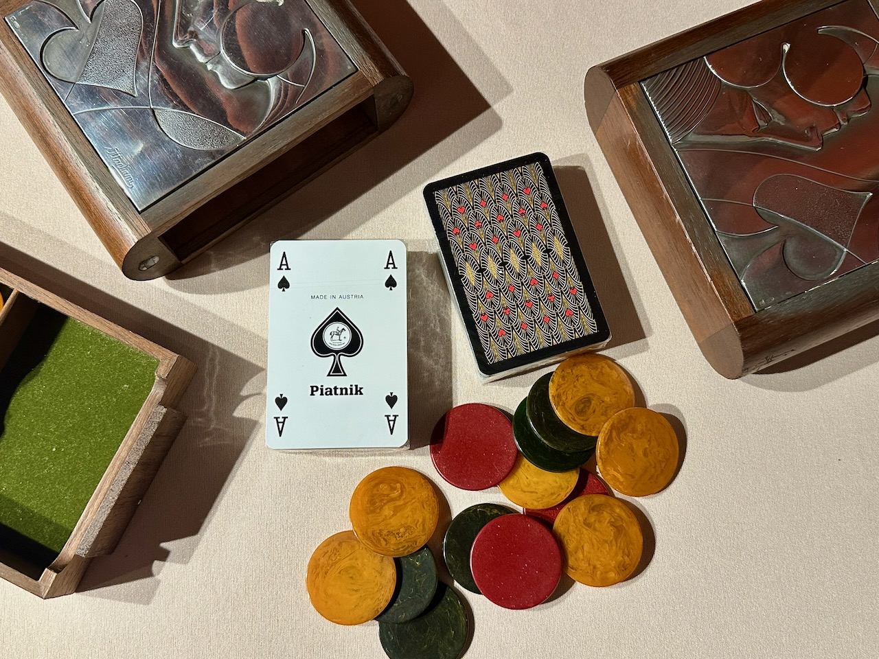 The silver panels are impressed with the number 925 and the Italian maker’s marks, Ottaviani was well known for their refined metalwork and for combining silver with fine exotic woods. Authentic bakelite gambling chips have been included in the center compartment and the playing cards are a special set made in Vienna.