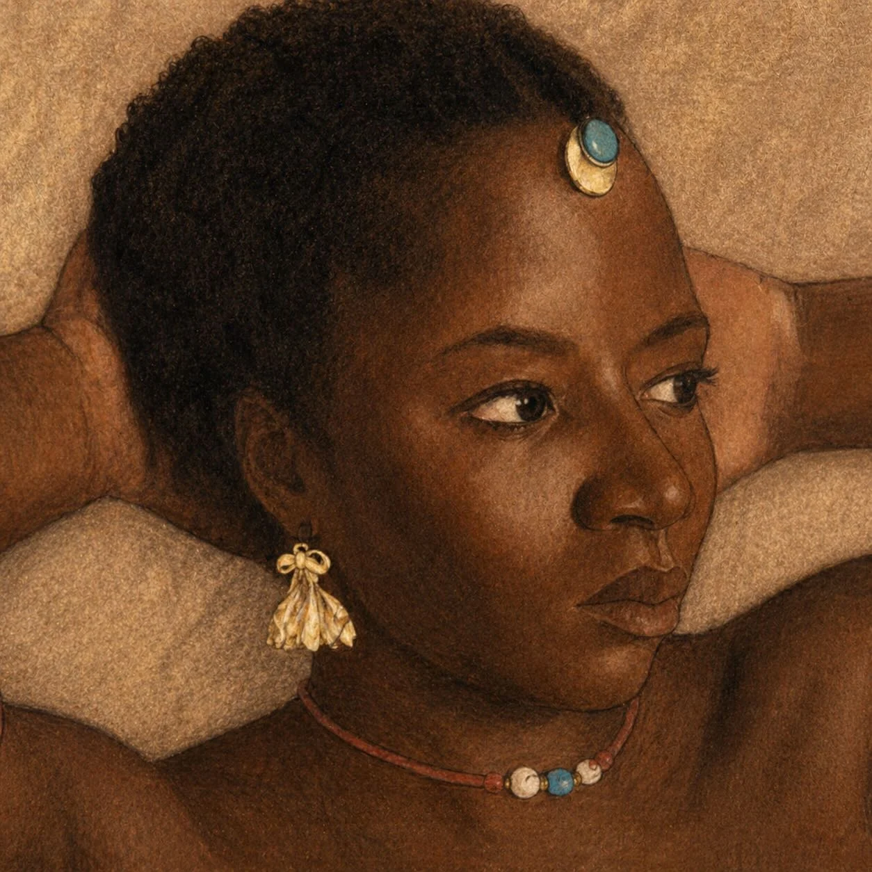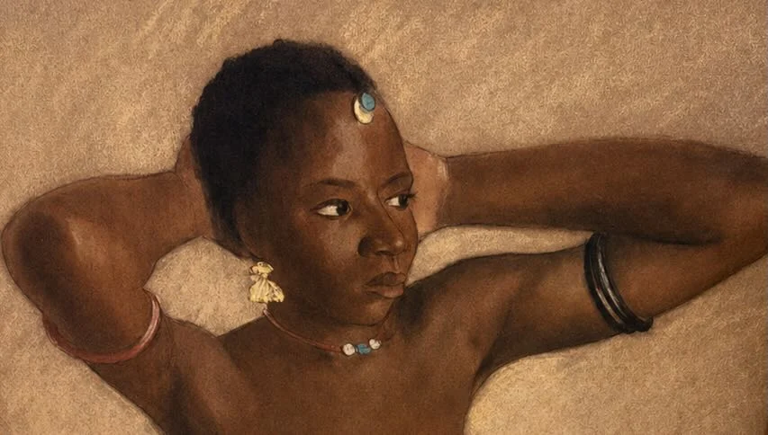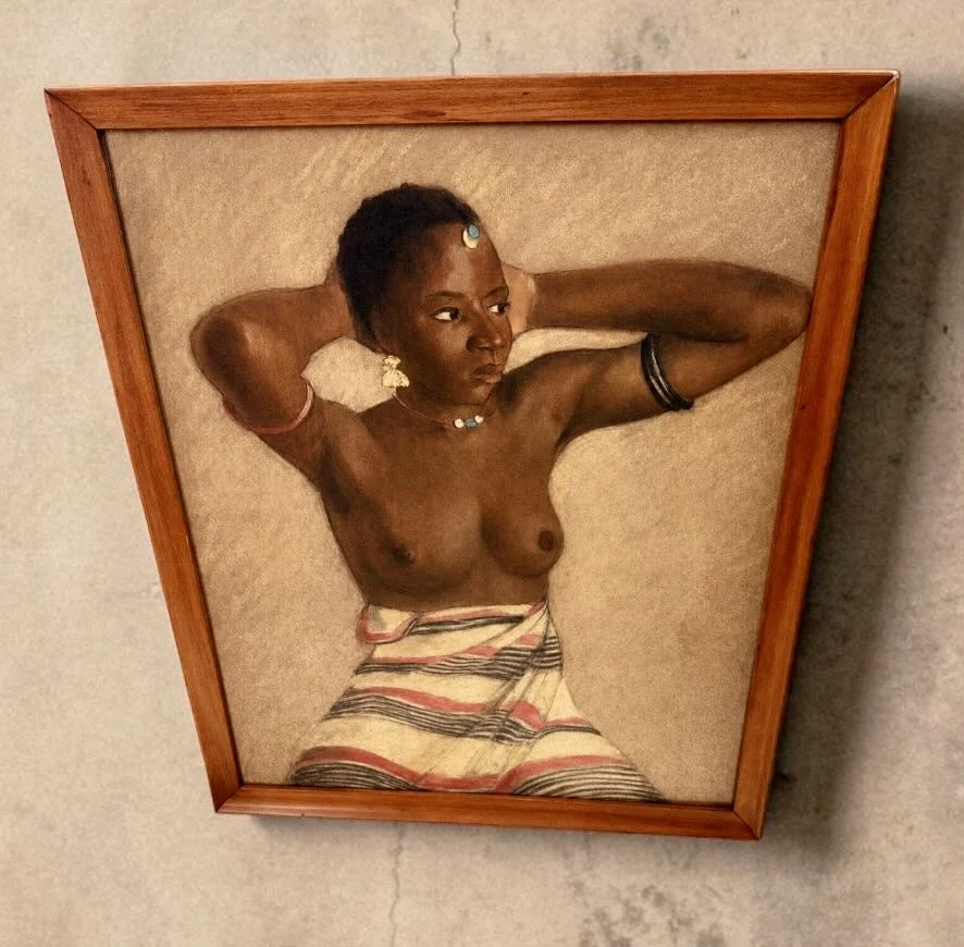 This evocative charcoal and watercolor painting presents an African woman with a powerful sense of quiet dignity, beauty, and composure. Likely dating from the mid 20th century, circa 1940s to 1960s, the work reflects a modernist figurative sensibility, with the sitter shown in a confident pose, her arms raised behind her head and her gaze turned to the side. The artist signature, Lila Boumendil, uses charcoal to define the figure with sculptural strength, while soft watercolor washes give warmth, atmosphere, and subtle tonal variation to the composition.