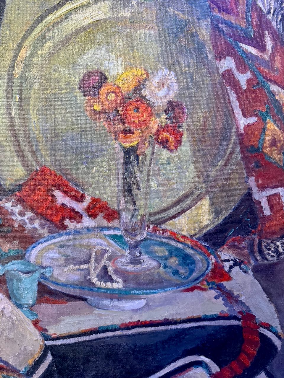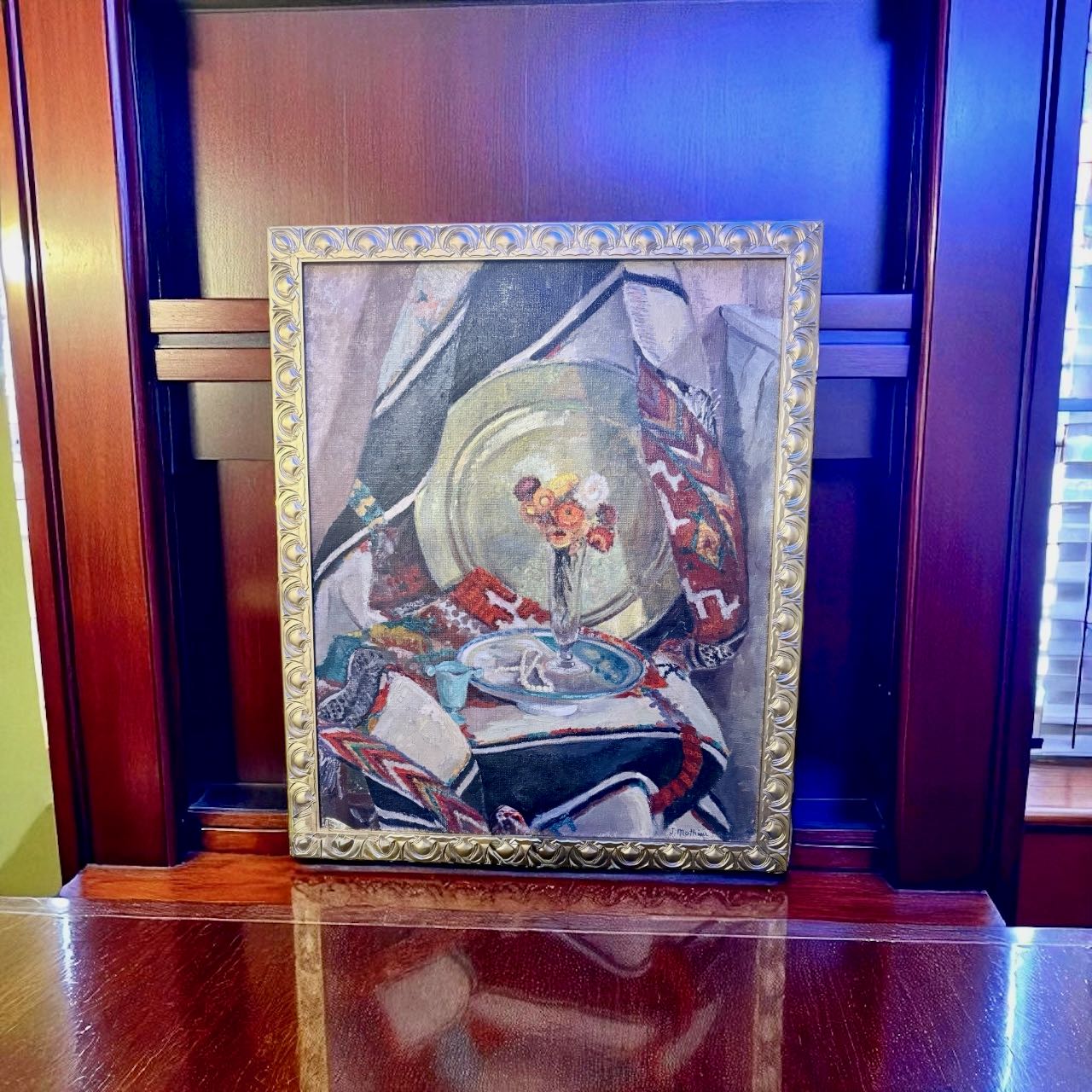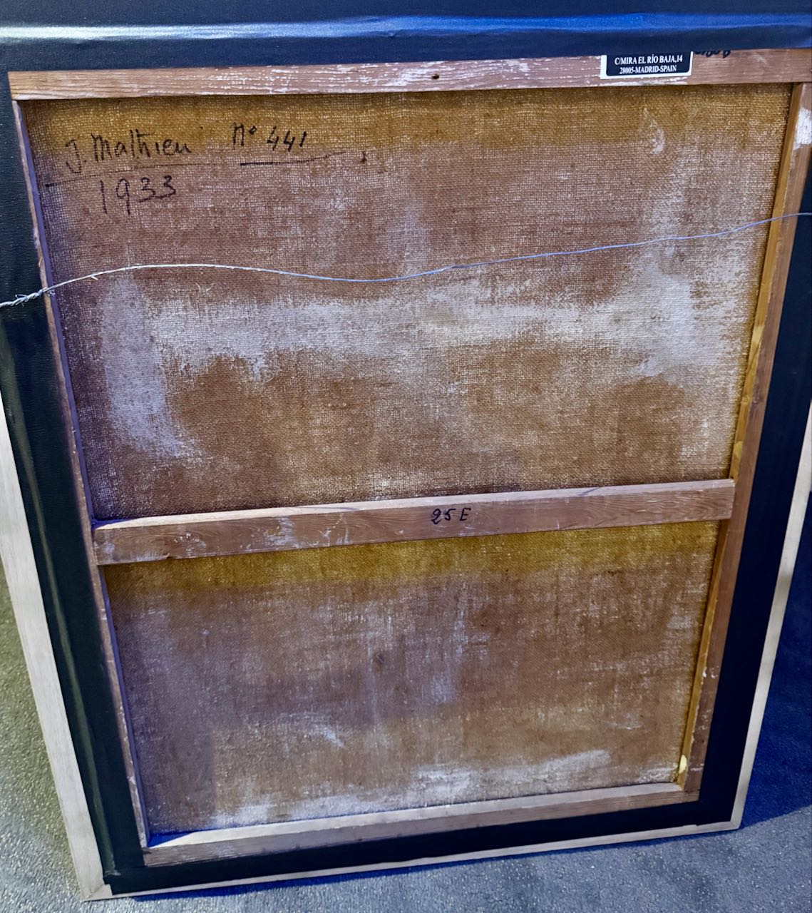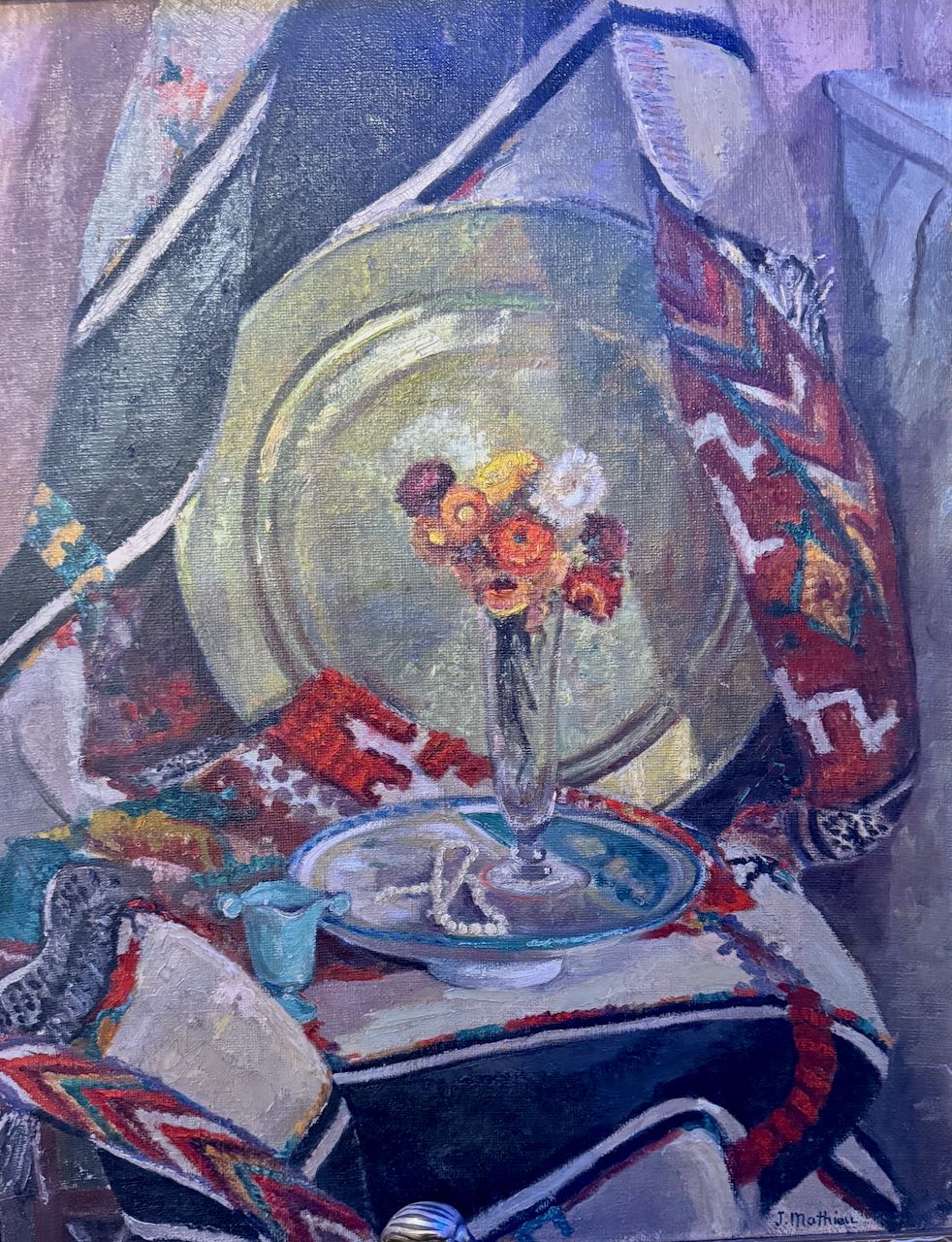 An elegant and evocative still life painted in 1933 by French artist Jean Mathieu (1882–1965). Executed in oil on burlap, this composition reveals a refined balance of texture and color, depicting a delicate glass vase of flowers set against a richly patterned textile and a golden platter. The work is beautifully presented in a stylized frame with a gold finish, complementing its luminous tones and period character. The title, Le Collier d’Aïcha (“Aïcha’s Necklace”), lends the painting a subtle oriental allure, enhanced by the intricate fabric patterns and warm palette that evoke a quiet sophistication.