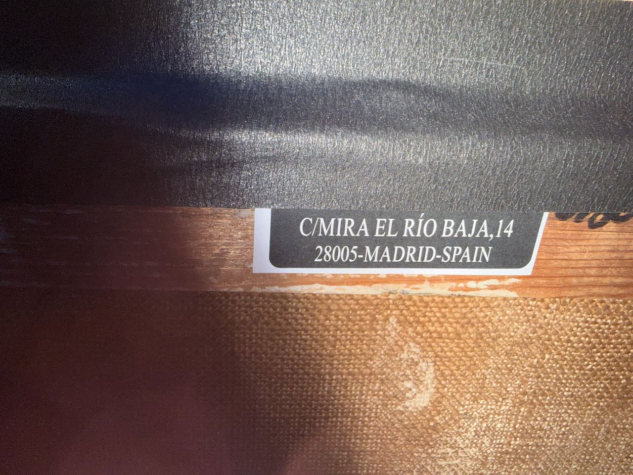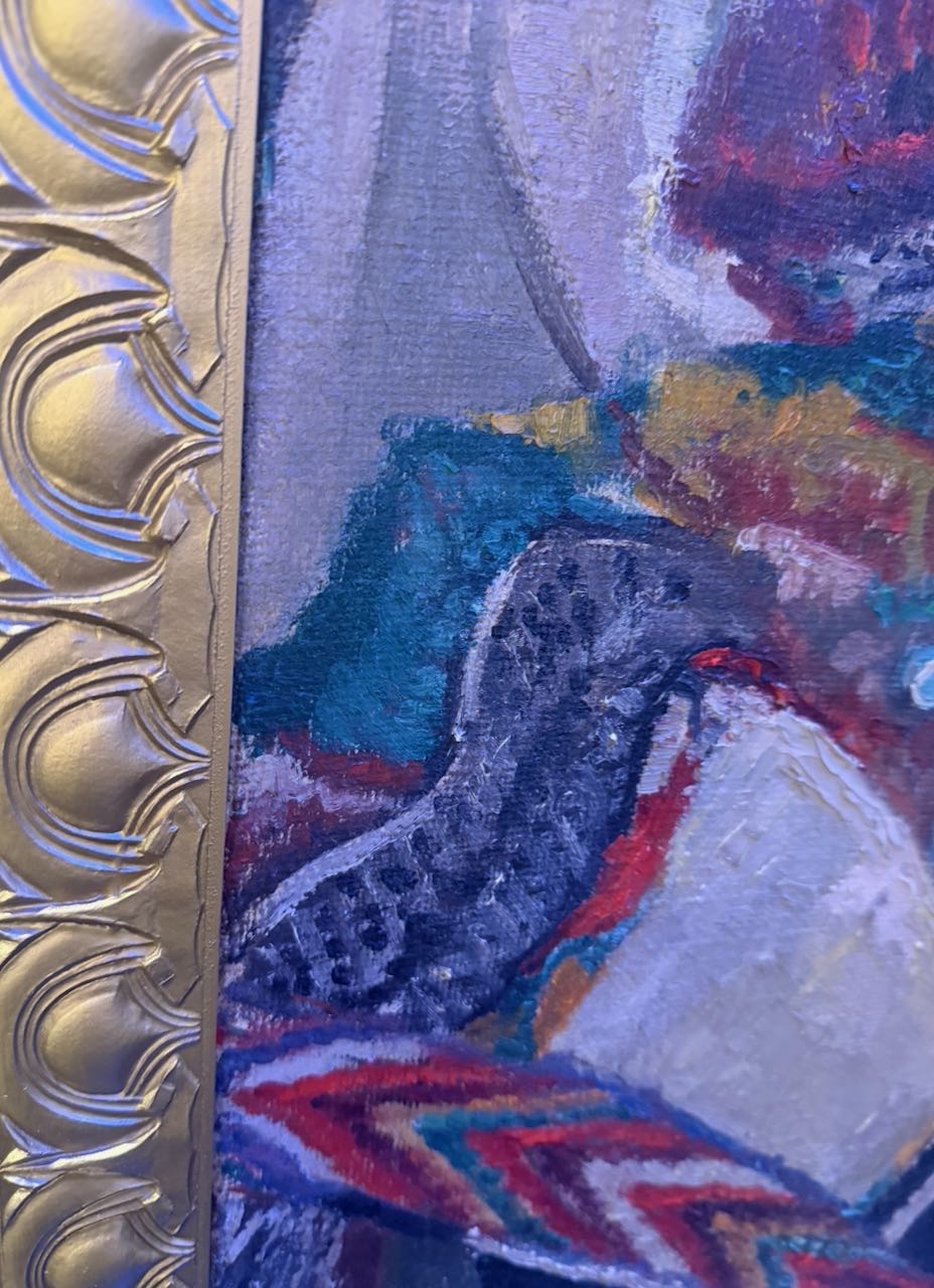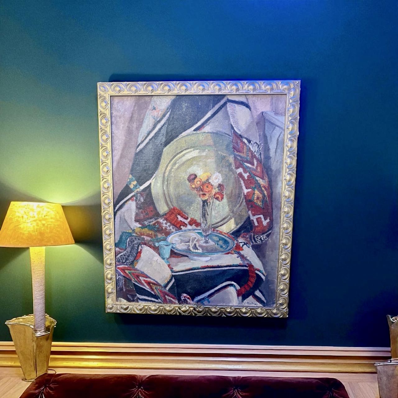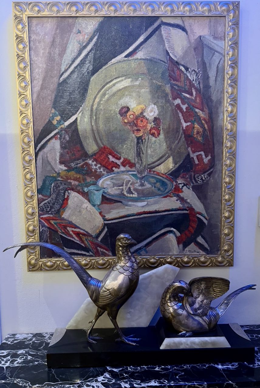 An elegant and evocative still life painted in 1933 by French artist Jean Mathieu (1882–1965). Executed in oil on burlap, this composition reveals a refined balance of texture and color, depicting a delicate glass vase of flowers set against a richly patterned textile and a golden platter. The work is beautifully presented in a stylized frame with a gold finish, complementing its luminous tones and period character. The title, Le Collier d’Aïcha (“Aïcha’s Necklace”), lends the painting a subtle oriental allure, enhanced by the intricate fabric patterns and warm palette that evoke a quiet sophistication.