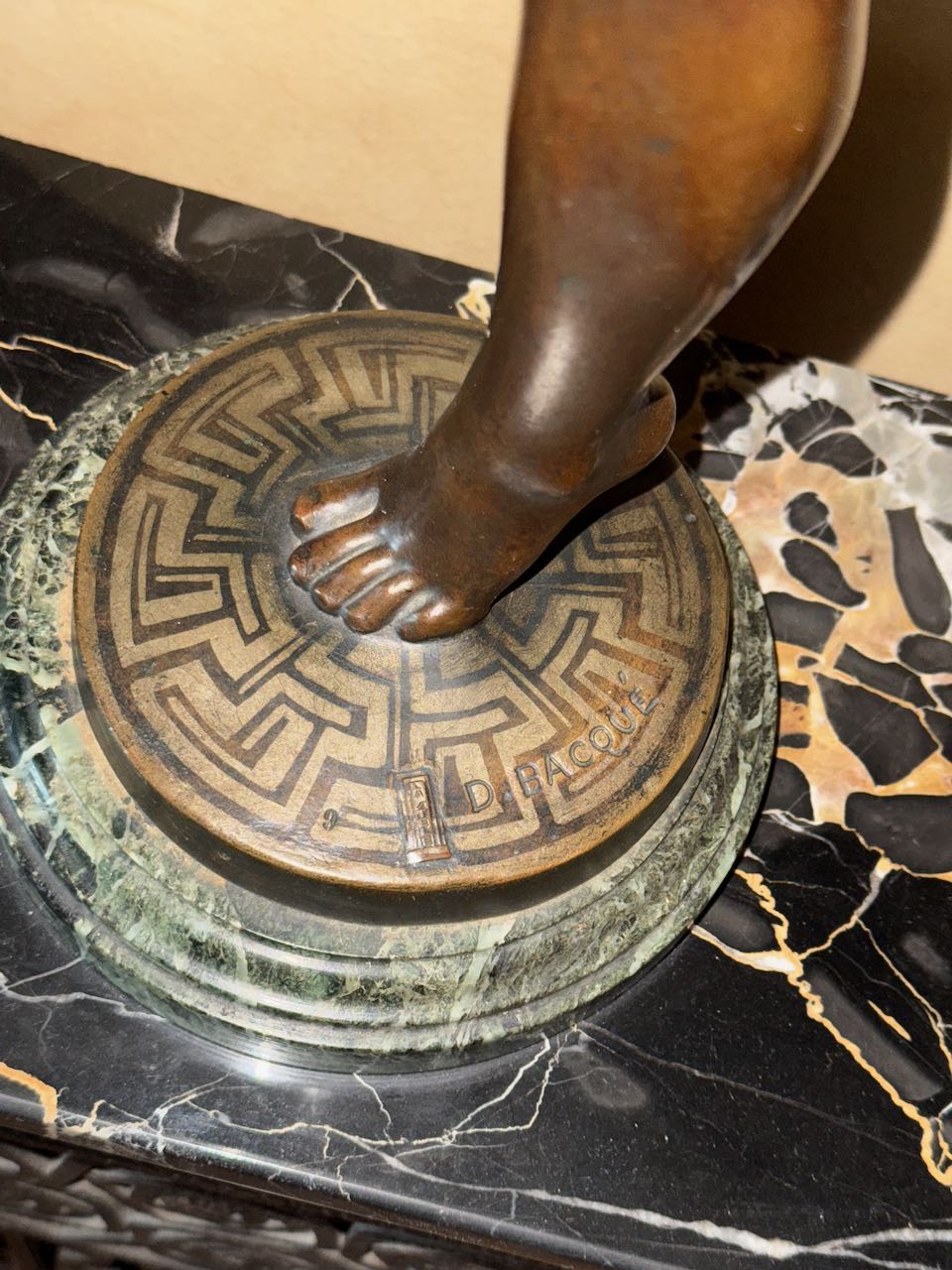 Mounted on a circular green marble base, the sculpture features a bronze plinth inscribed with a subtle geometric maze motif and the artist's signature, marked “Dinandrie”—a term used for fine bronze craftsmanship often incorporating mixed metalwork. Bacqué’s attention to surface and proportion elevates this piece beyond decorative art into serious sculpture.