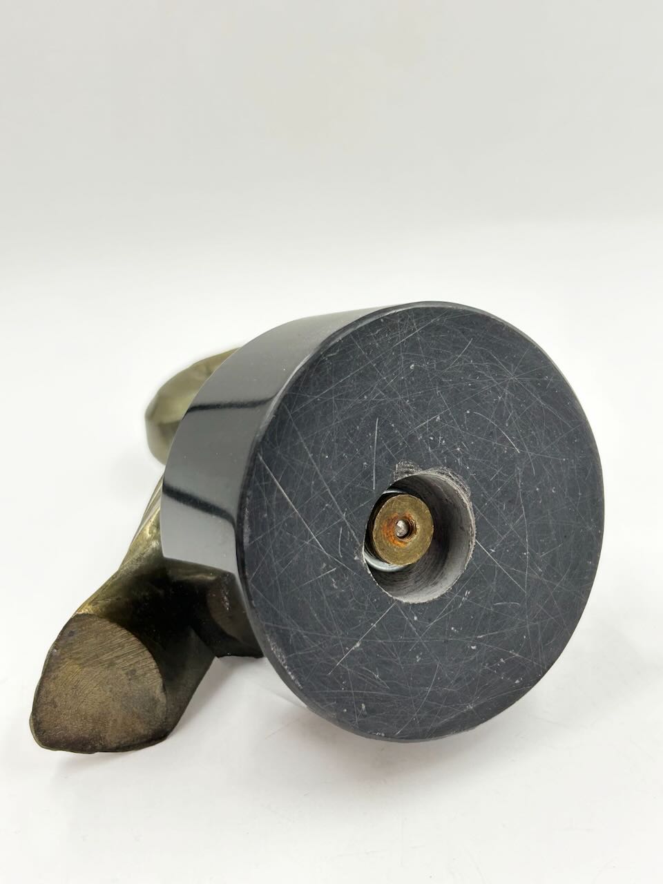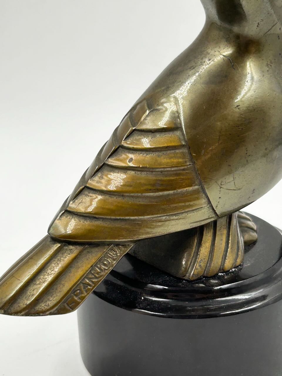 Franjou’s pelican exists both as a small desk sculpture and as a radiator mascot. Yours is currently on a marble base, which indicates a decorative desk model or a mascot that was later mounted for the desk. If you see a central threaded hole or fixed stud under the bird’s feet, it likely began life as a mascot. If the underside is smooth with no automotive mounting hardware, it was made as a desk sculpture.