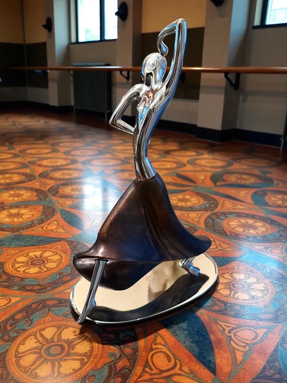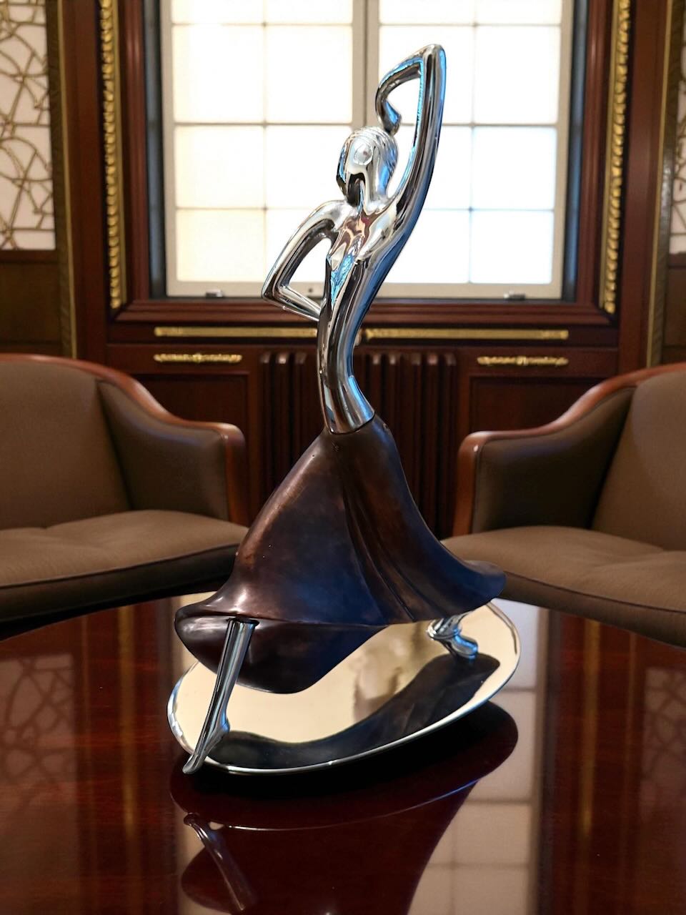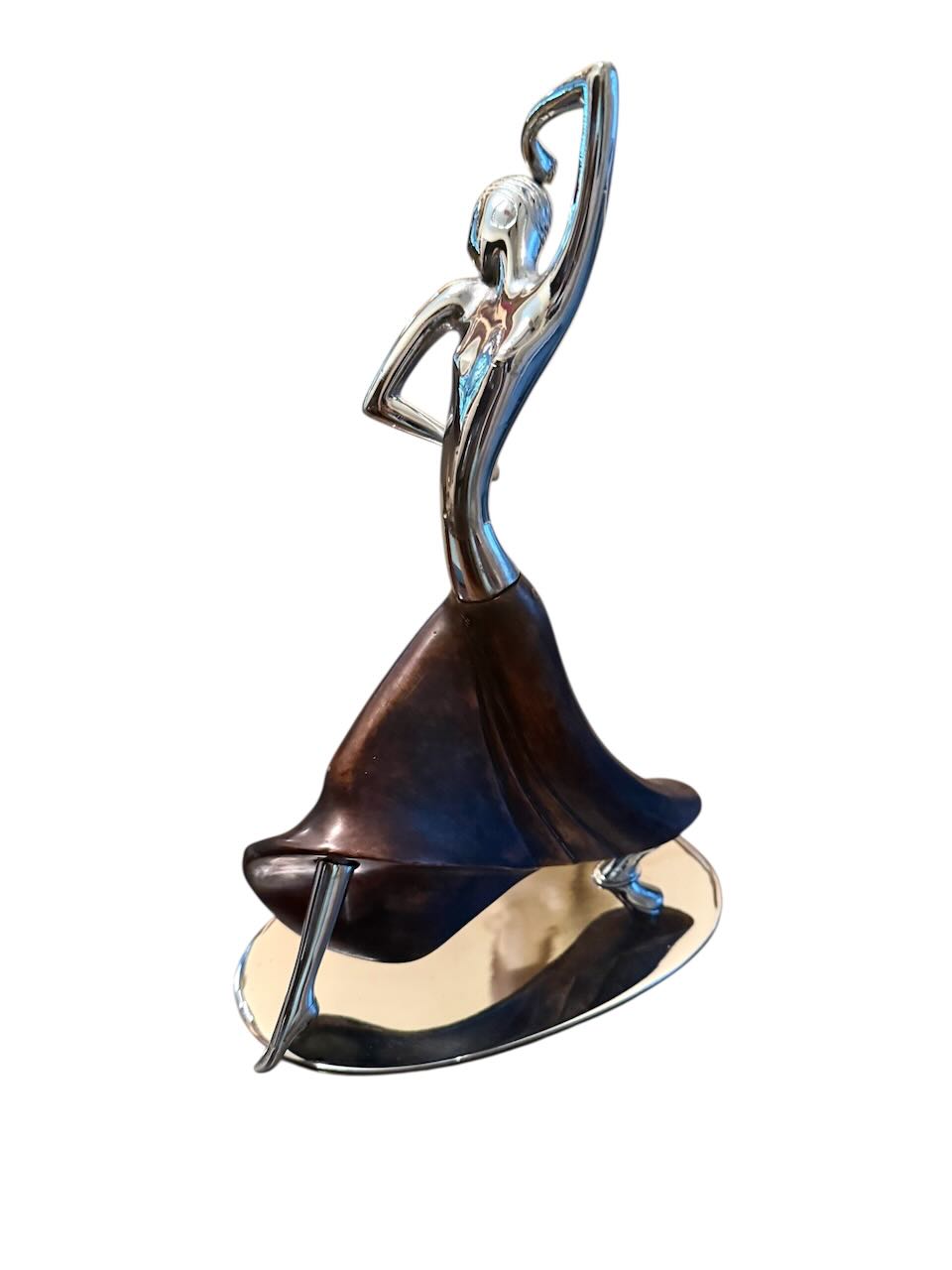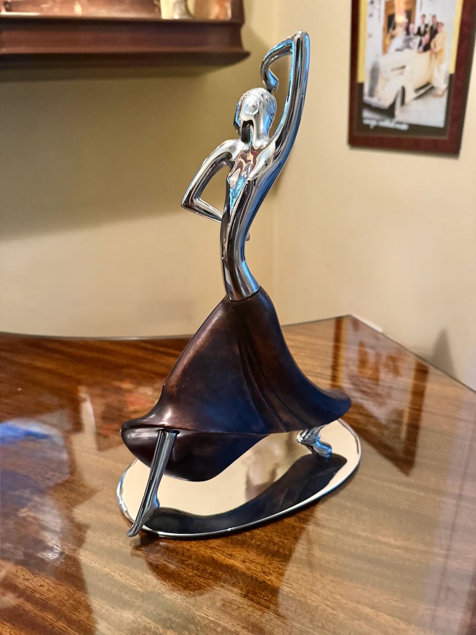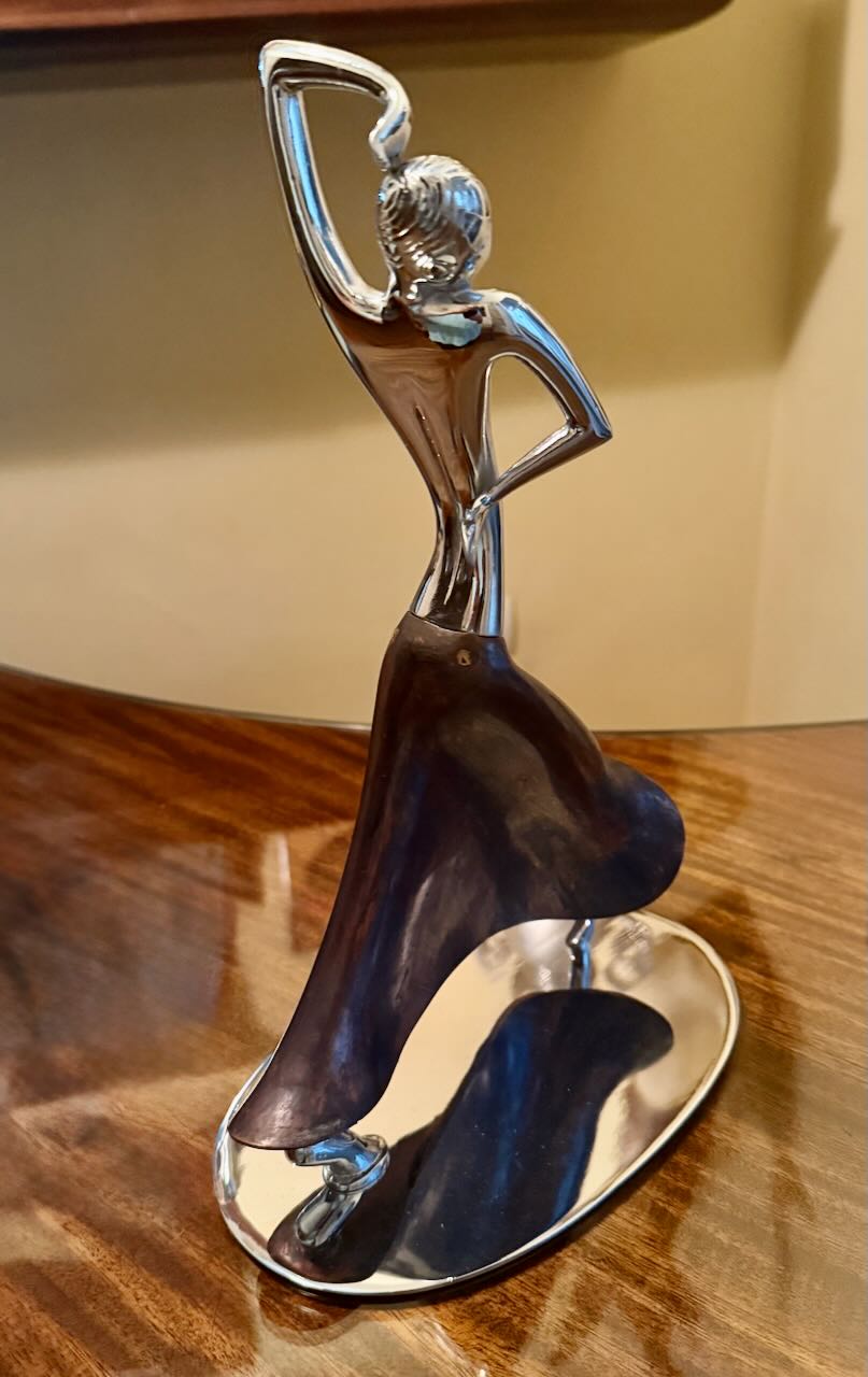 This sculpture stands an impressive 11.5 inches tall, a larger and more dramatic size than most Hagenauer figures. The design reflects both the glamour and rhythm of Josephine Baker’s stage presence, expressed through sinuous Art Deco geometry and refined simplicity. The polished chrome body contrasts beautifully with the deep bronze patina of the dress, a finish that has developed a rich tone over time with soft variations of brown and copper. This dual surface treatment highlights the sophistication of Hagenauer’s material mastery and his ability to merge industrial modernity with sensual movement.