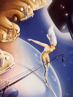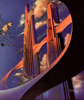 Radebaughs style combined Art Deco elegance with mid-century futurism. He used smooth gradients, vibrant color, and sweeping lines to create depth and movement. His airbrush technique gave metal surfaces and city skylines an almost luminous, otherworldly glow. Each composition balanced technical precision with romantic optimism, capturing both the beauty of machines and the wonder of human progress. His images embody the optimism of an age that saw design as the path to a better world.