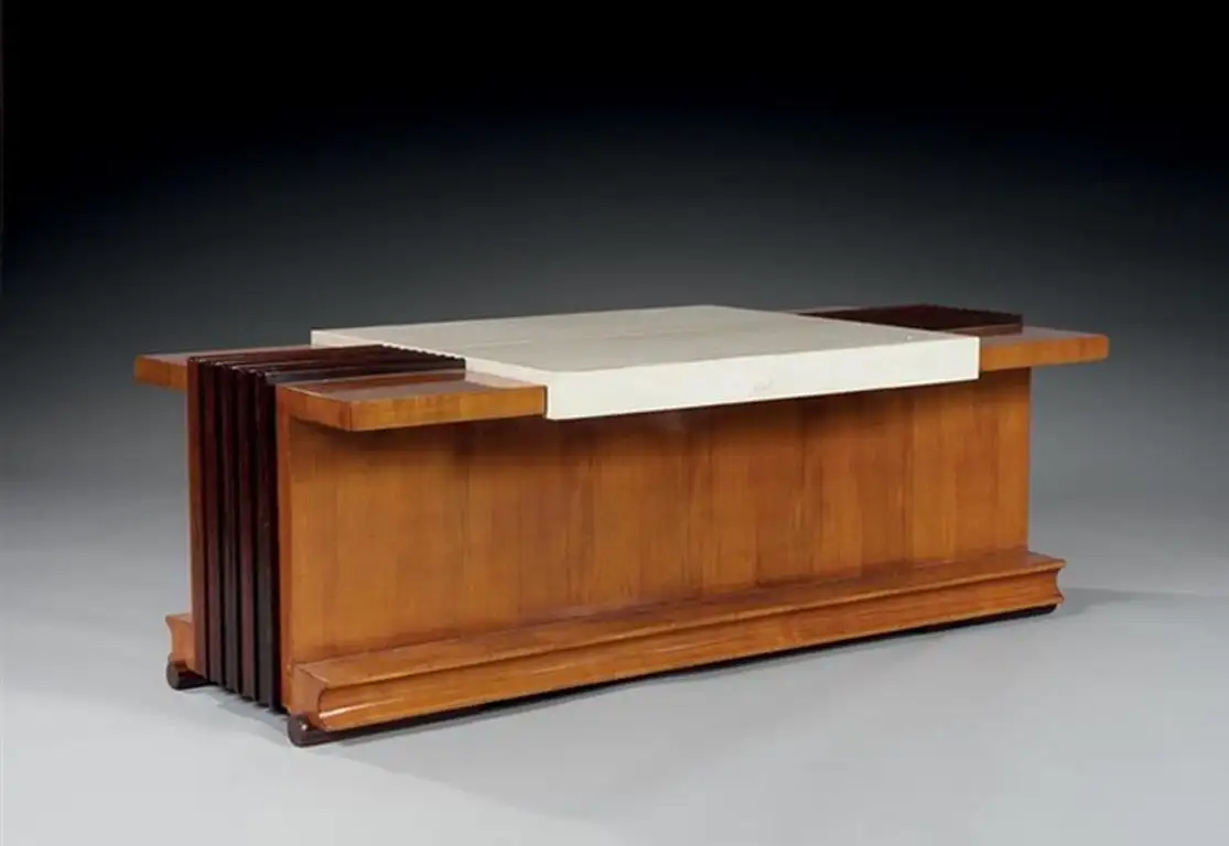 The work of Dominique is defined by balanced geometry, where rectilinear forms are softened by subtle curves shaped around human use. The firm favored luxurious materials, including exotic woods, bronze, copper, and refined metal inlays. Dominique gained early recognition through commissions for figures such as Jean Puiforcat and the perfumer Houbigant. Their participation in the 1925 Paris Exposition firmly established their reputation on an international stage. Throughout the 1930s, the firm produced furniture and interiors for both private clients and public institutions. Dominique was commissioned to design interiors for luxury ocean liners, including the Normandie, where their refined modernism complemented maritime grandeur. They also worked extensively with the Mobilier National on official state projects. The house remained active into the postwar period, continuing under the direction of Alain Domin into the 1970s.
