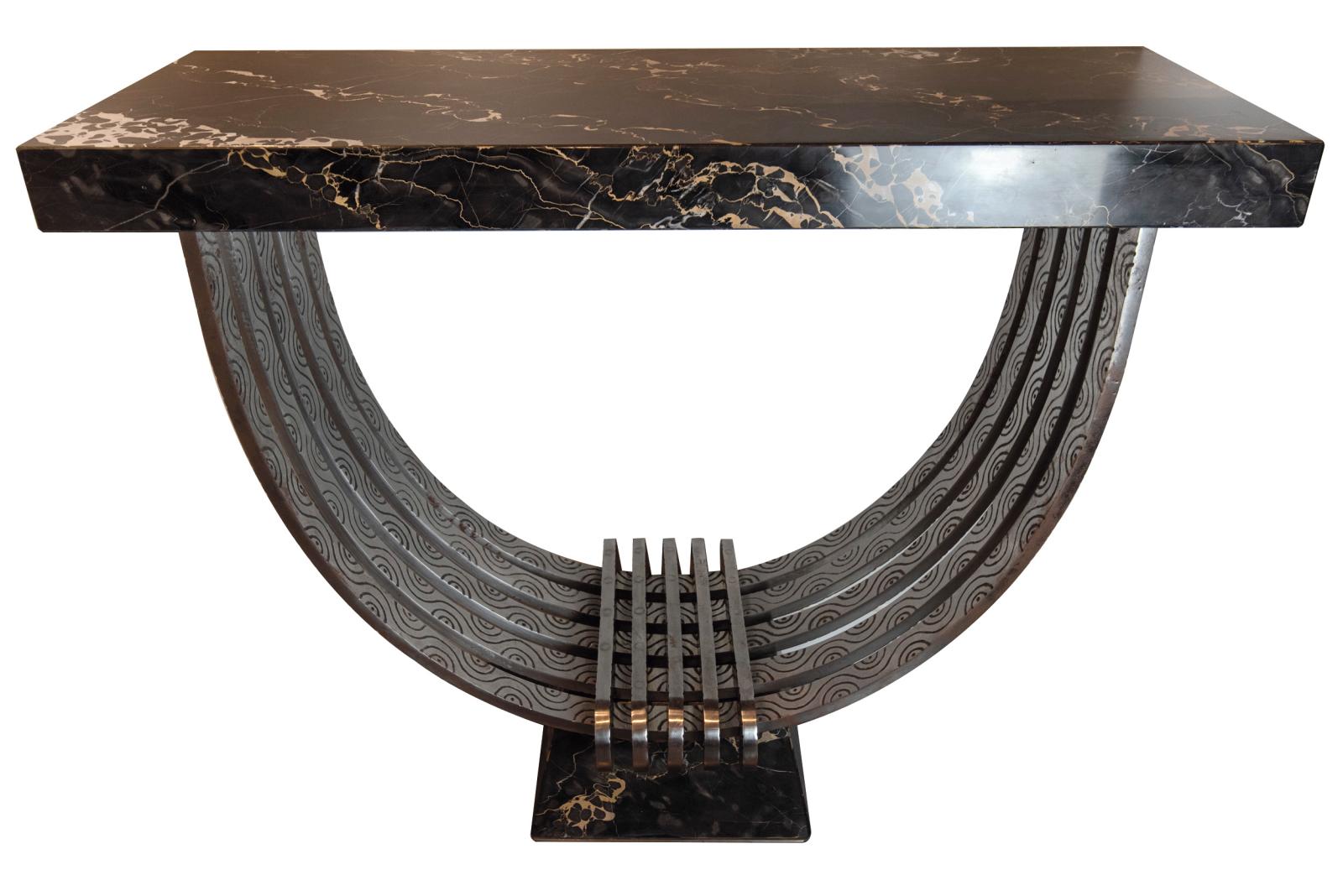 Edgar Brandt was born in Paris in 1880 and trained at the École Nationale Professionnelle de Vierzon, where he developed a deep understanding of metallurgy and precision engineering. He began his career creating weapons and military equipment, but his artistic vision soon led him toward decorative metalwork. In 1901, he opened his own forge and started producing objects that combined technical mastery with artistic expression. His early designs reflected the fluid, organic lines of Art Nouveau, but by the 1920s, he had transitioned to the geometric order and elegance of Art Deco. Brandt’s breakthrough came at the 1925 Paris Exposition, where his monumental wrought-iron gate, La Porte d’Honneur, created with glassmaker René Lalique, became one of the exhibition’s defining works. This fusion of metal and glass demonstrated how craftsmanship could coexist with modern industry, marking Brandt as a pioneer in uniting art and engineering. Throughout his career, he produced everything from tables and lamps to large architectural commissions, all reflecting his belief that metal could be as expressive as marble or wood. His dedication to technical perfection and aesthetic innovation secured his reputation as one of the most important French designers of his time.
