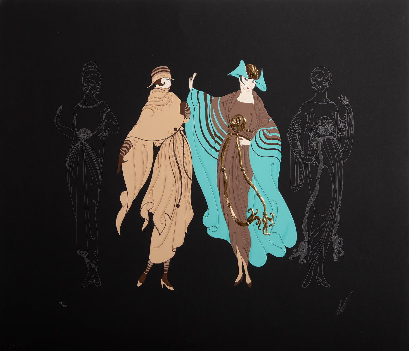 Ertes style blended fashion illustration, theatre design, and modern graphic composition into a unified and unmistakable language. His figures were elongated and elegant, often framed by bold geometry or flowing ornament that balanced movement with precision. Color played a central role, with saturated hues and dramatic contrasts heightening the sense of glamour. He favored clean lines, stylized poses, and intricate patterns that combined luxury with clarity. Across all mediums, his work embodied the sophistication, fantasy, and sleek visual rhythm that define the Art Deco aesthetic.