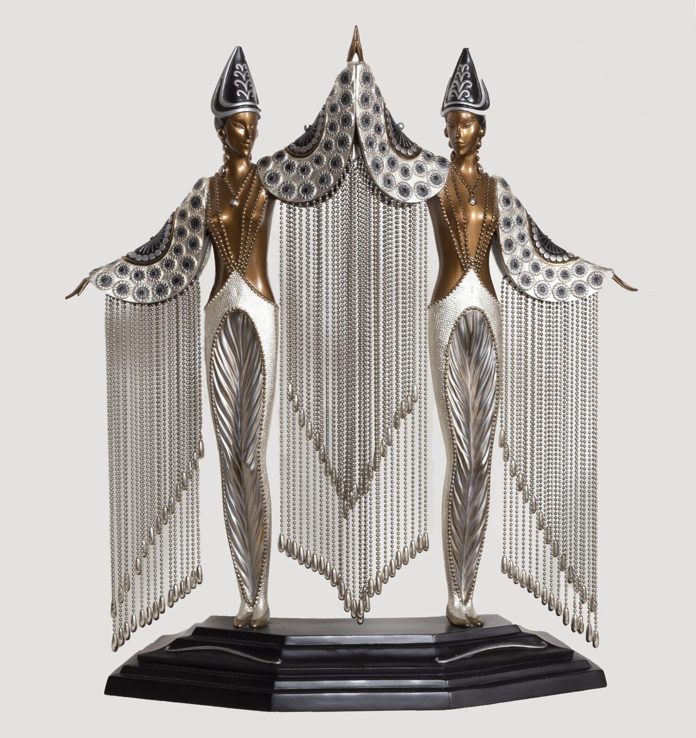Erté’s illustrations and stage designs shaped the visual language of Art Deco with their streamlined silhouettes, geometric structure, and sumptuous detail. His work appeared regularly in Vogue, Cosmopolitan, and especially Harper’s Bazaar, for which he created more than two hundred covers and countless interior illustrations. His drawings combined fashion, fantasy, and architecture, presenting figures that were elongated, stylized, and impossibly refined. He brought the same sense of drama to the theatre, designing costumes and sets for the Folies Bergère, the Ziegfeld Follies, La Bohème, and major film productions including Ben Hur. When Art Deco fell out of favor in the mid century, his popularity faded, but a revival of interest in the 1960s launched a second career that lasted until his death in 1990. During this period he created serigraphs, limited edition prints, and bronze sculptures that translated his early design language into new mediums. Works such as Symphony in Black became icons of the Deco revival, reaffirming his place as one of the movement’s essential artists.