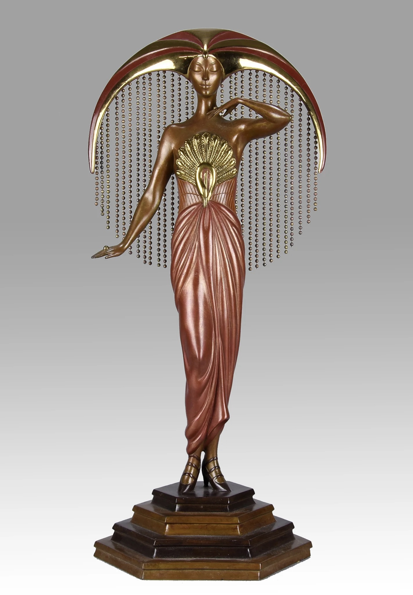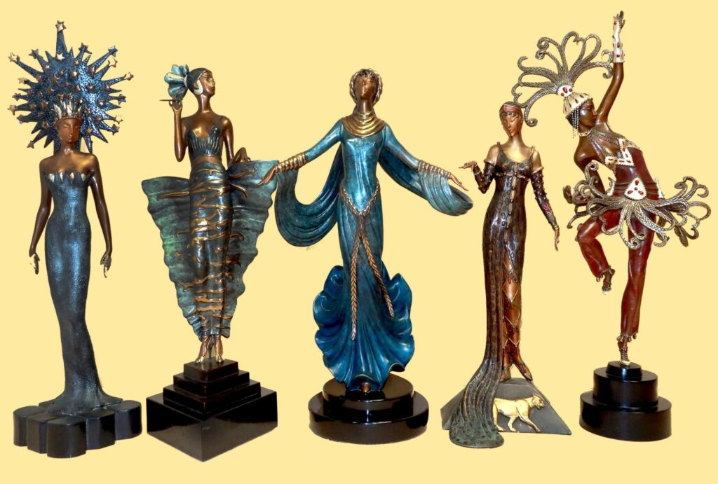 Erté’s illustrations and stage designs shaped the visual language of Art Deco with their streamlined silhouettes, geometric structure, and sumptuous detail. His work appeared regularly in Vogue, Cosmopolitan, and especially Harper’s Bazaar, for which he created more than two hundred covers and countless interior illustrations. His drawings combined fashion, fantasy, and architecture, presenting figures that were elongated, stylized, and impossibly refined. He brought the same sense of drama to the theatre, designing costumes and sets for the Folies Bergère, the Ziegfeld Follies, La Bohème, and major film productions including Ben Hur. When Art Deco fell out of favor in the mid century, his popularity faded, but a revival of interest in the 1960s launched a second career that lasted until his death in 1990. During this period he created serigraphs, limited edition prints, and bronze sculptures that translated his early design language into new mediums. Works such as Symphony in Black became icons of the Deco revival, reaffirming his place as one of the movement’s essential artists.