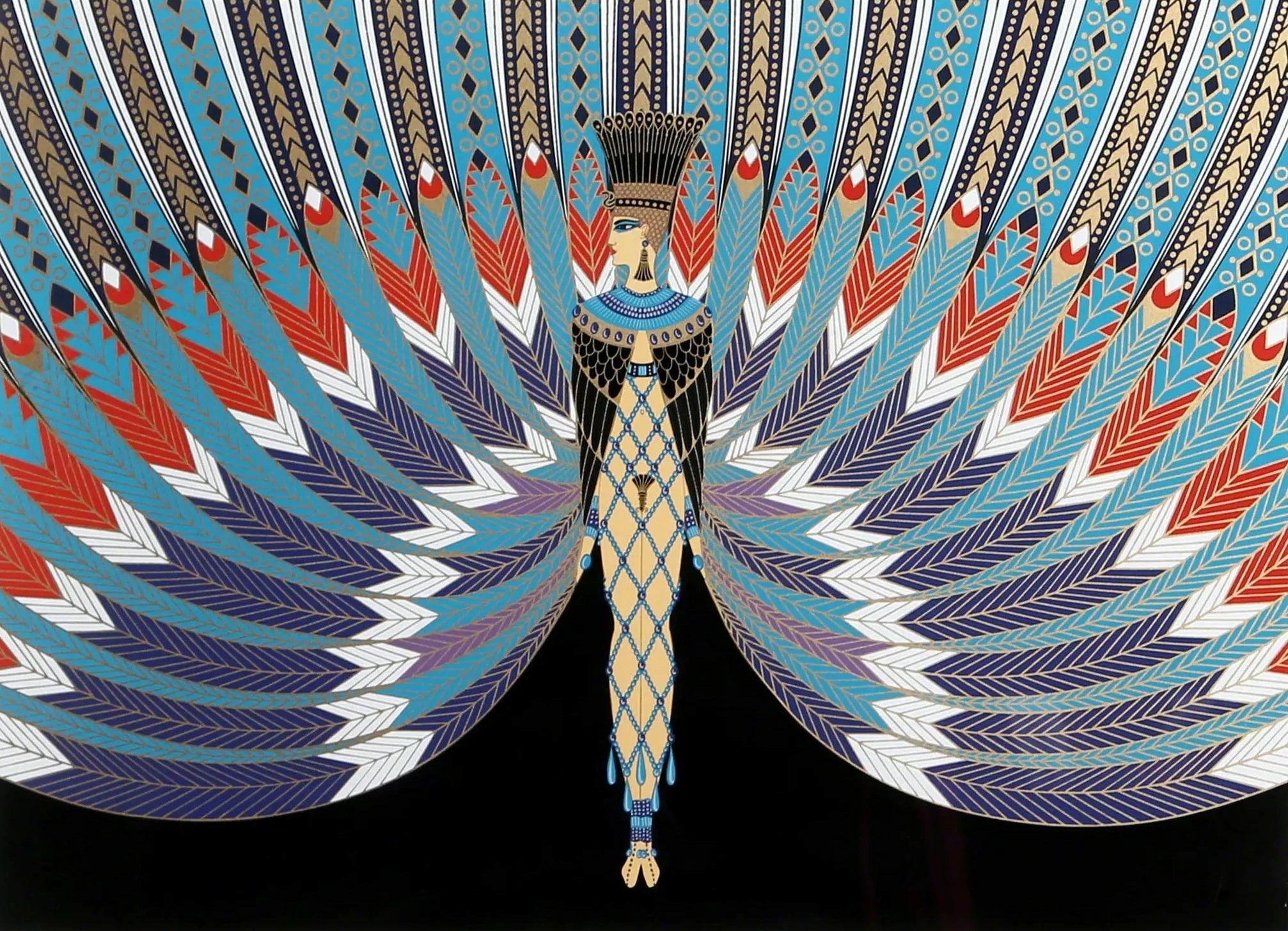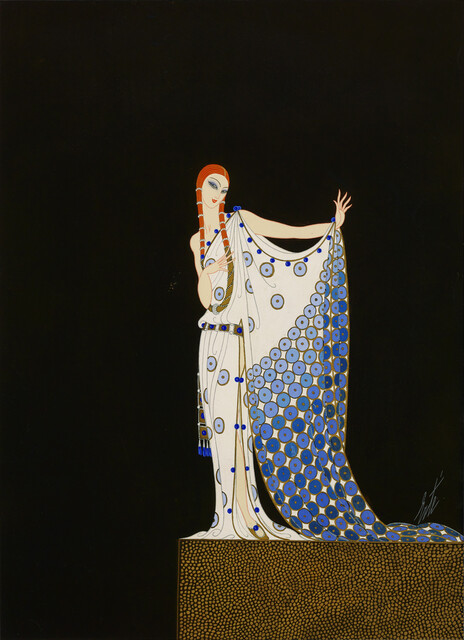Ertes style blended fashion illustration, theatre design, and modern graphic composition into a unified and unmistakable language. His figures were elongated and elegant, often framed by bold geometry or flowing ornament that balanced movement with precision. Color played a central role, with saturated hues and dramatic contrasts heightening the sense of glamour. He favored clean lines, stylized poses, and intricate patterns that combined luxury with clarity. Across all mediums, his work embodied the sophistication, fantasy, and sleek visual rhythm that define the Art Deco aesthetic.