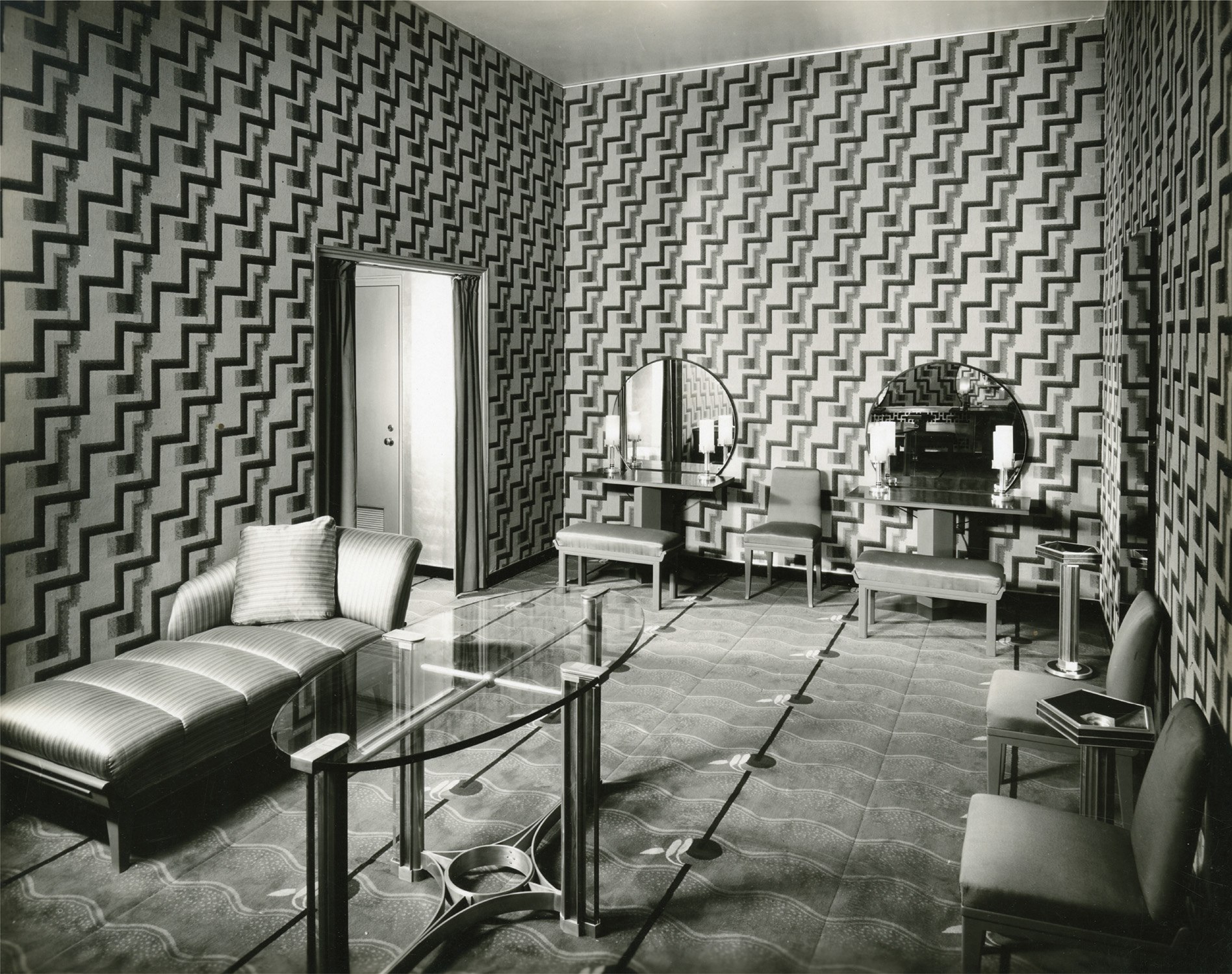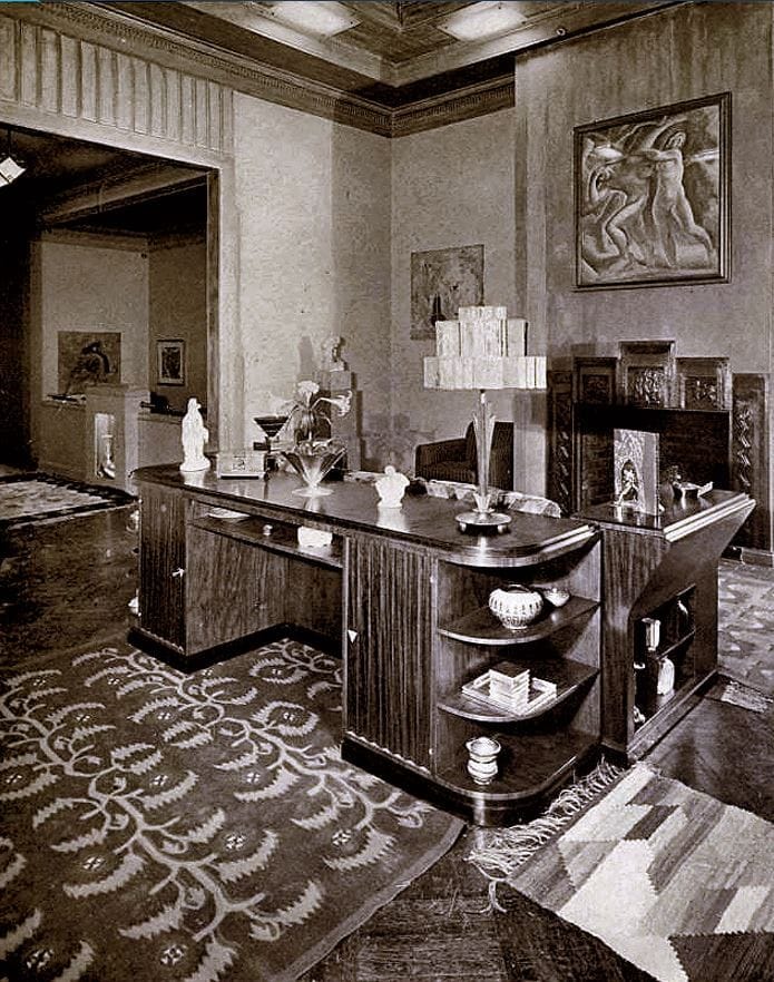 During World War I, when architectural work grew scarce, Schoen temporarily became general manager of his uncle’s International Oxygen Company in Newark. After the war, he returned to design and produced a series of branch banks for the Public National Bank of New York through the 1920s. The decisive turning point in his career came after he visited the 1925 Paris Exposition des Arts Décoratifs et Industriels Modernes. Inspired by that fair, he opened an interior decorating gallery in New York and shifted much of his attention from architecture to interiors. There he designed furniture, lighting, rugs, and complete room settings in a distinctly American version of Art Deco, then often described as moderne. His work merged Viennese geometry with French elegance, and much of his furniture was produced by Schmieg, Hungate and Kotzian as highly refined one of a kind pieces. He was willing to use materials such as Fabrikoid, Flexwood, Monel, Bakelite, and polished metal to give his interiors a polished metropolitan modernity. Schoen became a visible figure in important exhibitions at Macy’s and the Metropolitan Museum, and he served on the cooperating committee for the Met’s 1929 show The Architect and the Industrial Arts. In 1930 Donald Deskey brought him in to design the interiors of the RKO Roxy at Rockefeller Center, a project praised at the time for its grace and refinement. His later commissions for hotels, showrooms, clubs, and the Cafritz house, along with signature pieces like his demilune chair and skyline inspired tables, confirmed his reputation as one of the most sophisticated American Art Deco designers, even earning him the nickname the American Ruhlmann.