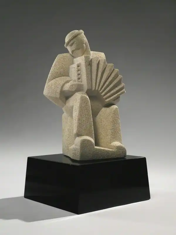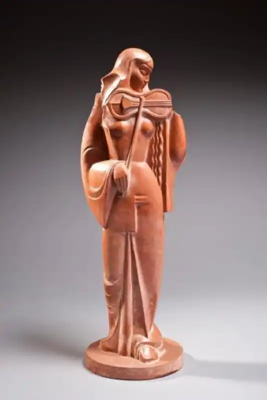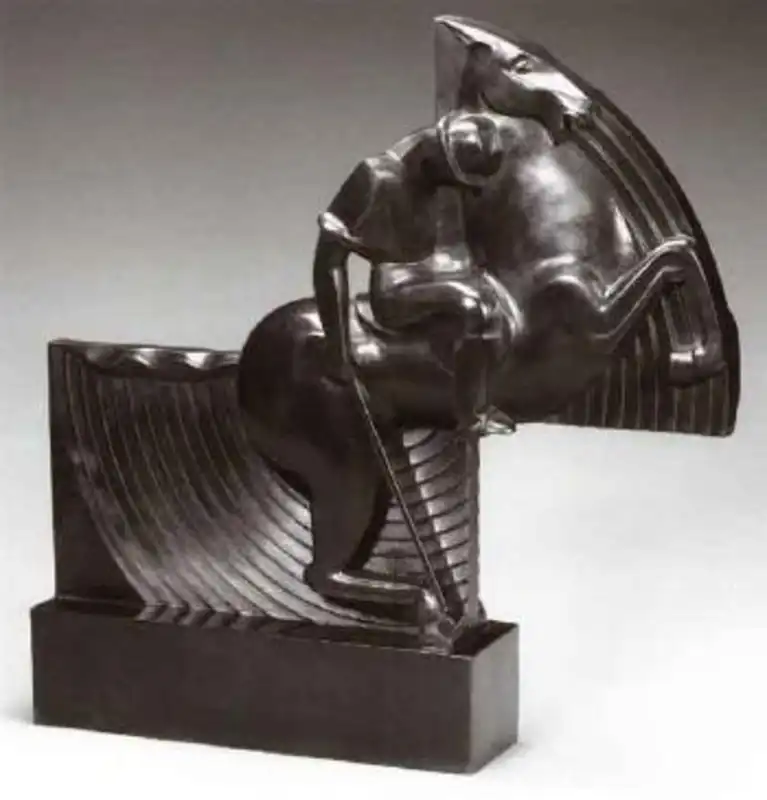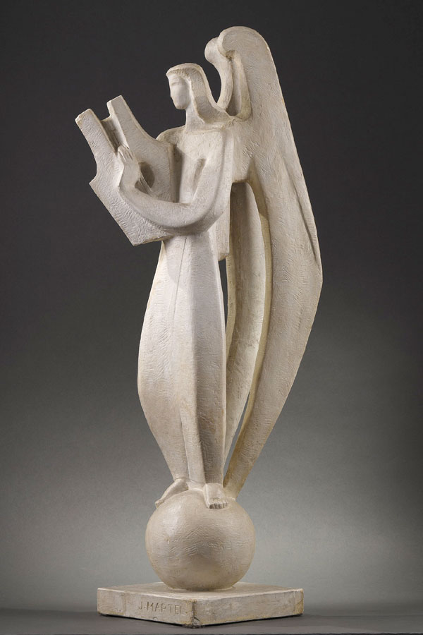 The Martels occupied a distinctive space between naturalist representation and Cubist abstraction. Their work was characterized by deformed figures and harmonious forms contained within simplified, smooth volumes, a hallmark of Art Deco sensibility. They devoted careful attention to material and color, which set them apart among modernist artists and allowed them to work convincingly across scales. Their 1930 piece La Locomotive en marche, rendered in polished zinc, conveyed Futurist ideas about speed and motion. Around 1937, their work shifted toward greater abstraction, as seen in pieces like Le Faucheur, La Danseuse, and Mélusine.