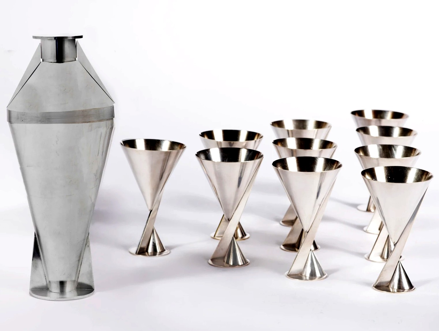 Desny’s work embraced pure geometric volumes and sharply defined forms that echoed early Cubism and functional modernism. Their pieces often used chromed metal or silver plate, polished to a mirror finish that heightened the clarity of each surface. Triangular bases, stepped profiles, and stacked cylinders gave their designs a sculptural architectural presence. They relied on industrial methods to achieve seamless construction and a refined sense of precision. The overall effect was minimal, futuristic, and strikingly modern for its time.
