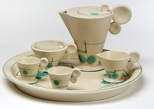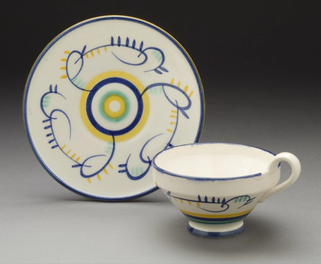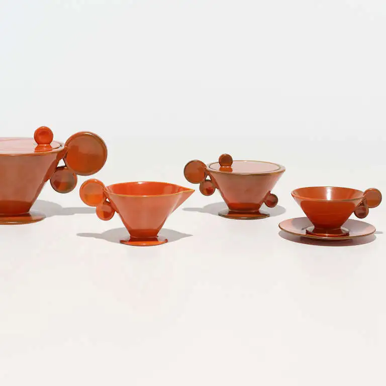 Heymann-Loebenstein’s designs ranged from sober and functional forms to playfully curved shapes, with glazes spanning bright colors such as lemon yellow, uranium red, and pitch black alongside pale monochromes. Her pieces were decorated variously with Kandinsky-like brushstrokes and East Asian motifs, and her double-disk handles in materials such as silver, ebony, and ivory became one of the company’s most striking trademarks. Her work defied easy categorization, with some pieces resembling constructivist sculptures while others served as refined tableware for wealthy customers wishing to break with tradition.