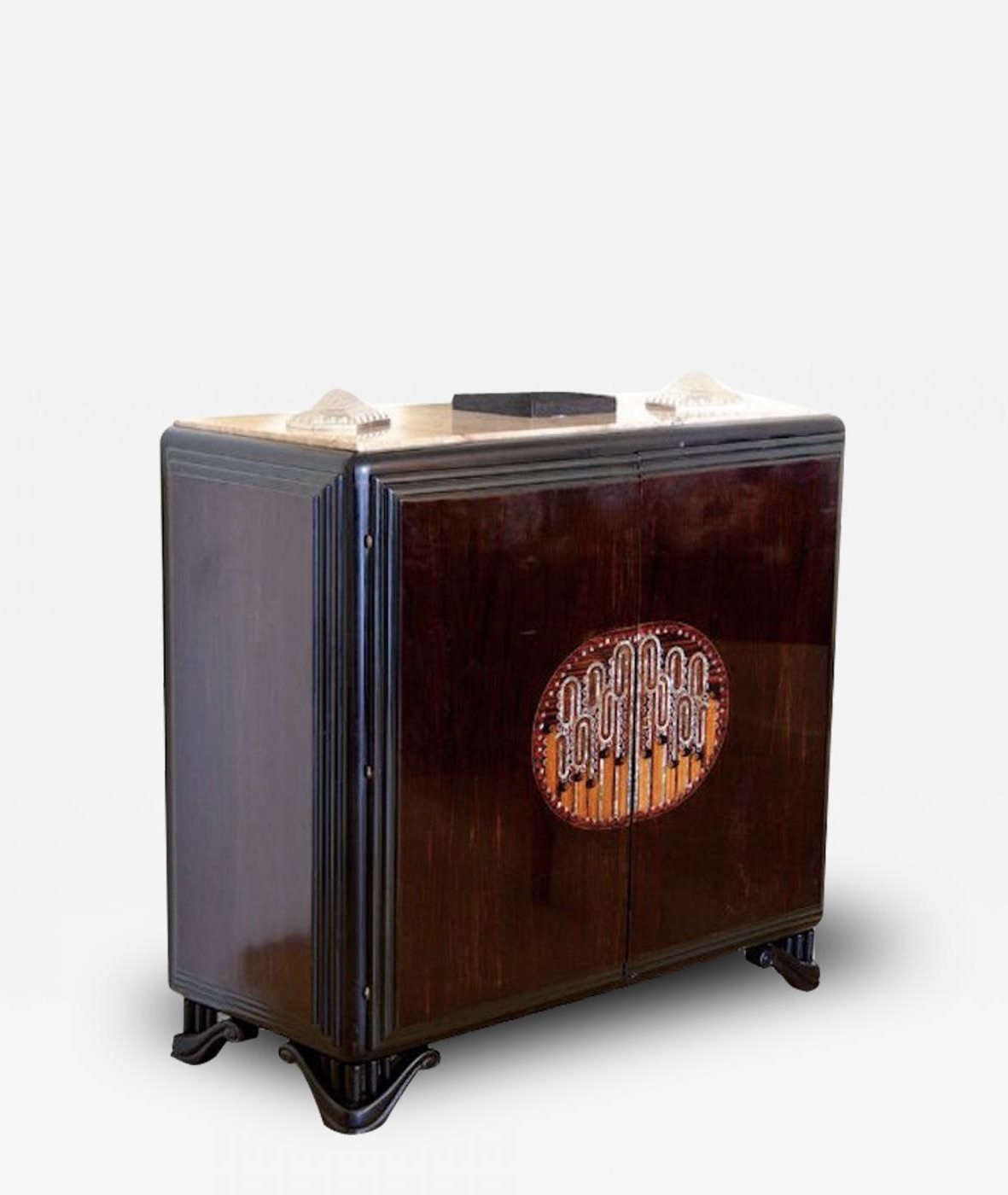 Dufrêne first showed his own work in 1902 and from 1903 onward exhibited regularly at the Salon d’Automne and the Salons of the Société Nationale des Beaux-Arts. At La Maison Moderne, he led a shift in the gallery’s production toward the popular Art Nouveau style before his own work evolved toward more structured, neoclassical forms. He designed across many media, including metalwork, ceramics, glass, and fabric, though he was best known for his furniture. He was one of the primary set designers on the 1919 film Le Carnaval des Vérités. Under his direction, the Maîtrise workshop at Galeries Lafayette produced high-quality furniture, textiles, carpets, wallpapers, and decorative objects intended for a wider public than elite collectors. His exhibit at the 1925 International Exposition of Modern Industrial and Decorative Arts in Paris helped solidify the quintessential Art Deco style, and he also designed luxury boutiques, a music salon, and the living room of the Ambassade Française pavilion for the exposition. He produced designs for Christofle, the large firm that manufactured high-quality Art Deco metalwork, and decorated rooms for the Palais de l’Élysée and numerous embassies on behalf of Le Mobilier National. His work was honored at the 1915 Panama-Pacific International Exposition in San Francisco and can be found today in the Musée des Arts Décoratifs and the Budapest Museum of Applied Arts.