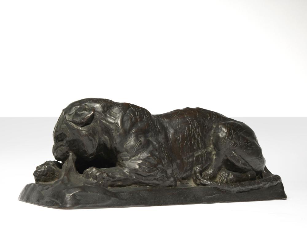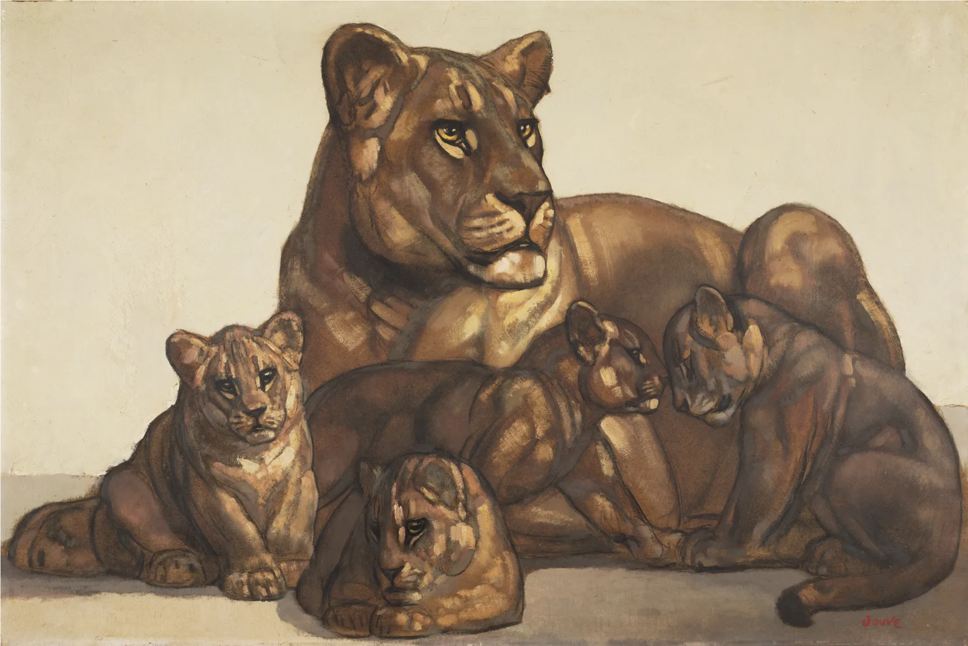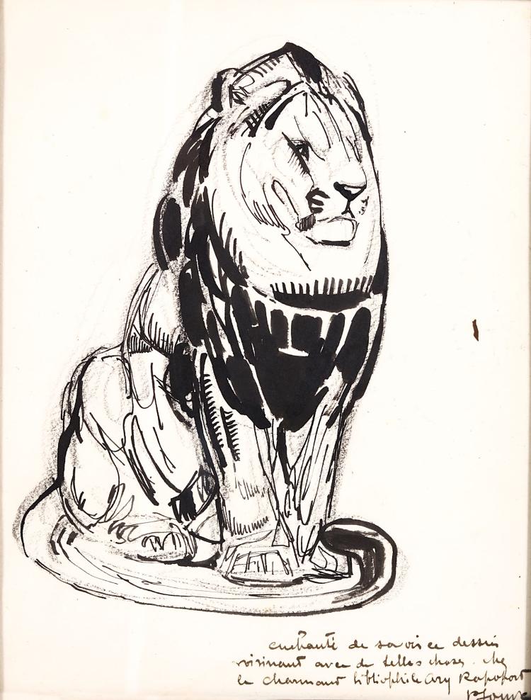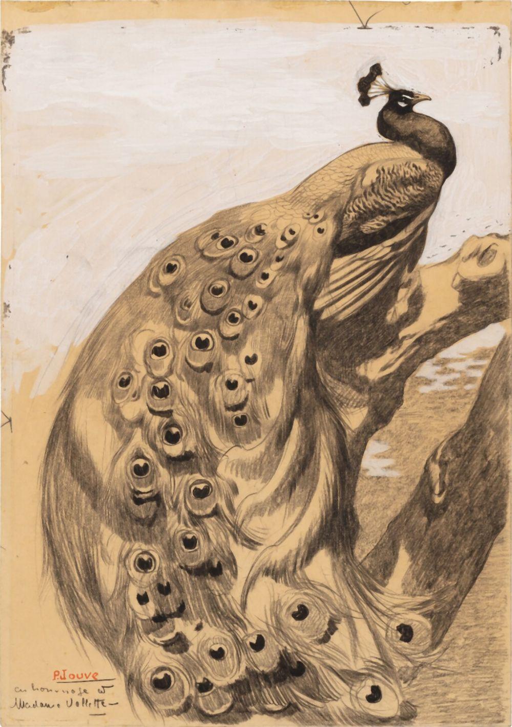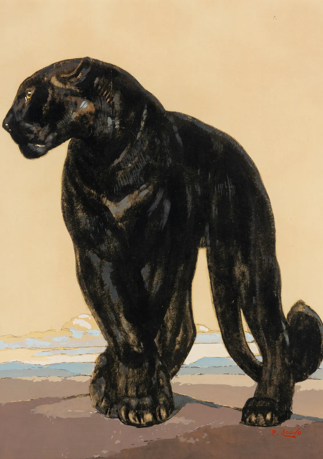 Jouve’s professional breakthrough came early when he contributed major decorative work to the 1900 Exposition Universelle, creating animal friezes and monumental sculptural forms that brought him public attention. In the years that followed, he exhibited regularly at the major Paris salons and gained support from the dealer Samuel Bing, who helped introduce his drawings, bronzes, ceramics, and decorative objects to a wider audience. His success also allowed him to travel extensively to zoos and later to North Africa, where new landscapes and animals expanded his visual vocabulary. After serving in the First World War, including traumatic time at the front and later work in the Army of the Orient, he returned to France with a renewed clarity and force. The delayed publication of his illustrations for Kipling’s Jungle Book greatly increased his reputation and brought him an international audience. A government travel grant then took him through Indochina, China, Ceylon, and India, and the studies he brought back deeply marked his mature work. In the 1920s and 1930s he produced some of his most celebrated paintings, prints, and decorative commissions, all distinguished by a purified line and a more controlled palette. He was awarded a Gold Medal at the 1925 International Exposition of Decorative Arts, confirming his place within the highest tier of French Art Deco. Major state and commercial commissions followed, including large paintings for the ocean liner Normandie, monumental works for the 1937 Paris exposition, and decorative projects for public buildings. Alongside these commissions, he continued to illustrate major literary texts and to exhibit constantly in France and abroad. By the middle of the twentieth century, Paul Jouve was recognized not just as an animal painter, but as one of the defining artists of Art Deco elegance and exotic modernity.