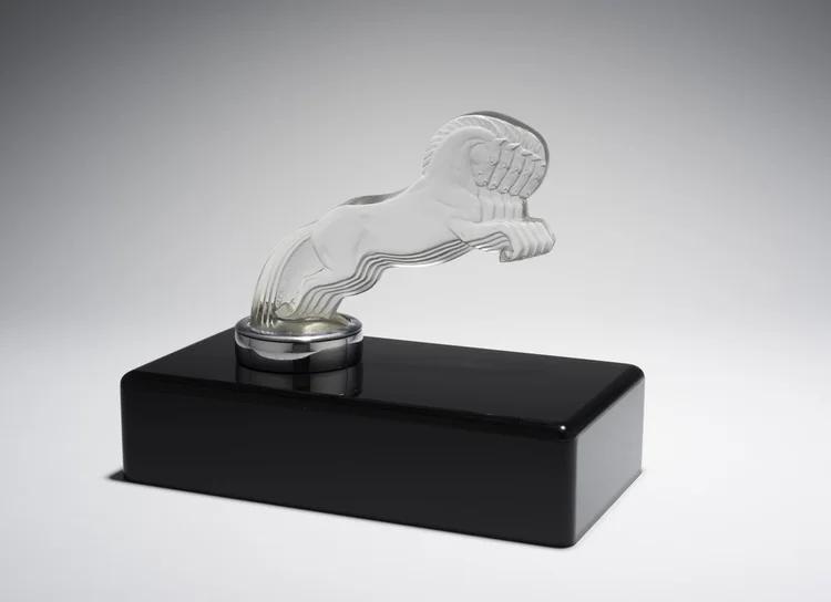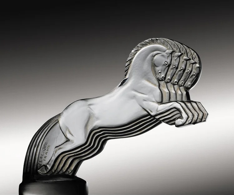 As his career evolved, Lalique shifted from jewelry to glassmaking, carrying his artistic sensibility into the Art Deco era. In the 1920s his designs became more architectural and stylized, reflecting the modern age through geometric forms and new materials like chrome, metal, and opalescent glass. He mastered glass chemistry to create pieces with unique luminosity, using oxides and phosphates to produce glowing, translucent effects that became his signature. His studio produced everything from perfume bottles and vases to lighting, tableware, and car mascots, many of which embodied the streamlined grace of the Art Deco aesthetic. Lalique’s glasswork was prominently displayed at the 1925 Paris Exposition Internationale des Arts Décoratifs, where his monumental glass fountain became one of the exhibition’s highlights. He also created the etched glass panels and chandeliers for the luxury ocean liner Normandie, merging art and engineering on an unprecedented scale. His work for prominent clients and celebrities such as Sarah Bernhardt solidified his reputation as the leading glass designer of his generation. Even after his death in 1945, Lalique’s name remained synonymous with artistic elegance and technical mastery, and his creations continue to be prized by collectors around the world.
