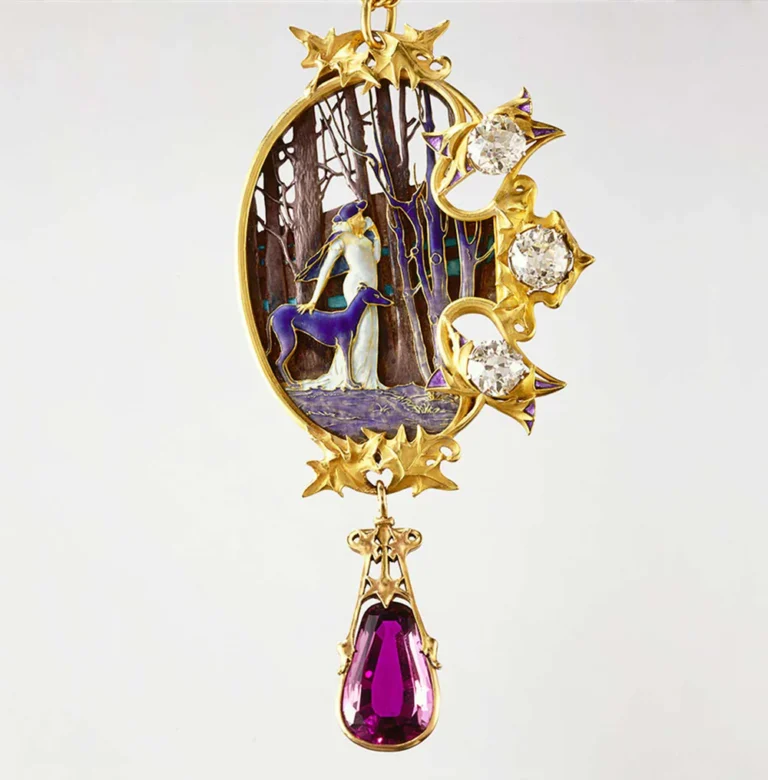 René Lalique was born in 1860 in the small town of Ay, France, and became one of the most innovative designers of the early twentieth century. His childhood spent among the natural landscapes of the Champagne region deeply influenced his artistic eye, instilling a fascination with organic forms that would define his career. He studied drawing in Paris and later attended the Sydenham Art College in London, where his technical and creative skills expanded rapidly. Returning to France, he apprenticed with goldsmith Louis Aucoq and soon began freelancing for prestigious houses such as Boucheron, Cartier, and Coty. In 1885 he established his own studio, where he began crafting jewelry that redefined the boundaries of design by merging fine art with decorative function. His early Art Nouveau creations combined gold, glass, enamel, and gemstones in delicate depictions of insects, flora, and mythological women. These works captured movement and life, setting Lalique apart as a visionary who elevated jewelry from ornament to art. By the early 1900s he was recognized internationally as a master craftsman whose creativity bridged nature, craftsmanship, and innovation.