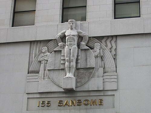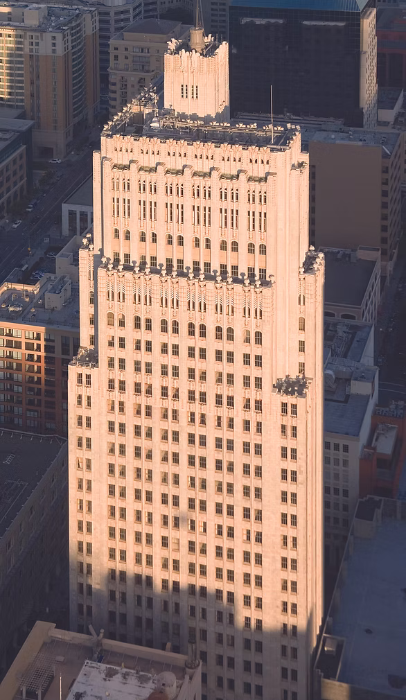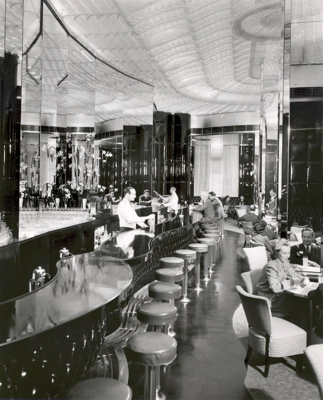 Pflueger’s earliest independent project was Our Lady of the Wayside Church in Portola Valley, completed in 1912 in a Spanish Mission Revival style, later declared California Historical Landmark number 909. In 1925, he completed the Pacific Telephone and Telegraph Company Building, a 26-story skyscraper that became the tallest building in San Francisco for the next 40 years. He went on to design 450 Sutter Street, completed in 1929, featuring triangular thrust window bays decorated with stylized Mayan designs in terra cotta, metals, marble, and glass. Pflueger was equally celebrated for his movie palaces, including the Castro Theatre in 1922, the Alhambra Theatre in 1926, and the 3,200-seat Paramount Theatre in Oakland in 1931, each drawing from a different well of historical and global influences. His firm’s last theatre project was the 1941 Art Deco remodel of the Metropolitan Theatre in Cow Hollow, which introduced streamlined chandeliers and murals by the Heinsbergen Decorating Company. His work extended to luxurious cocktail lounges such as the Top of the Mark at the Mark Hopkins Hotel, the Patent Leather Bar at the St. Francis Hotel, and the Cirque Room at the Fairmont. He chaired the committee of consulting architects on the San Francisco-Oakland Bay Bridge project and served on the committee responsible for the design of the Golden Gate International Exposition in 1939. For the Exposition’s second year, he organized the Art in Action exhibit and brought Diego Rivera to San Francisco to paint the monumental Pan American Unity mural. His final major work was the radical transformation of the I. Magnin flagship store at Union Square into a sleek International style design, completed posthumously in 1948.