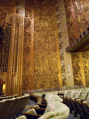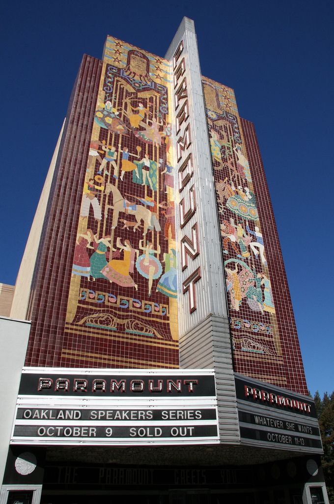 Left: Paramount Theatre, Oakland, Middle: Pacific Stock Exchange, Sansome Street entrance with “Progress” figures carved in Yosemite granite, 1929–1930, Right: Paramount Theatre lobby, Oakland