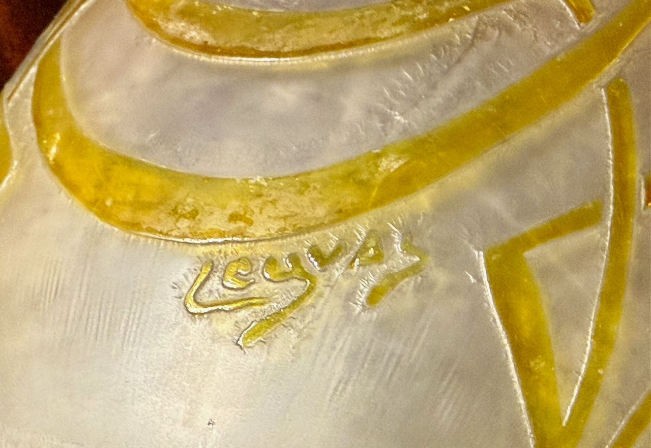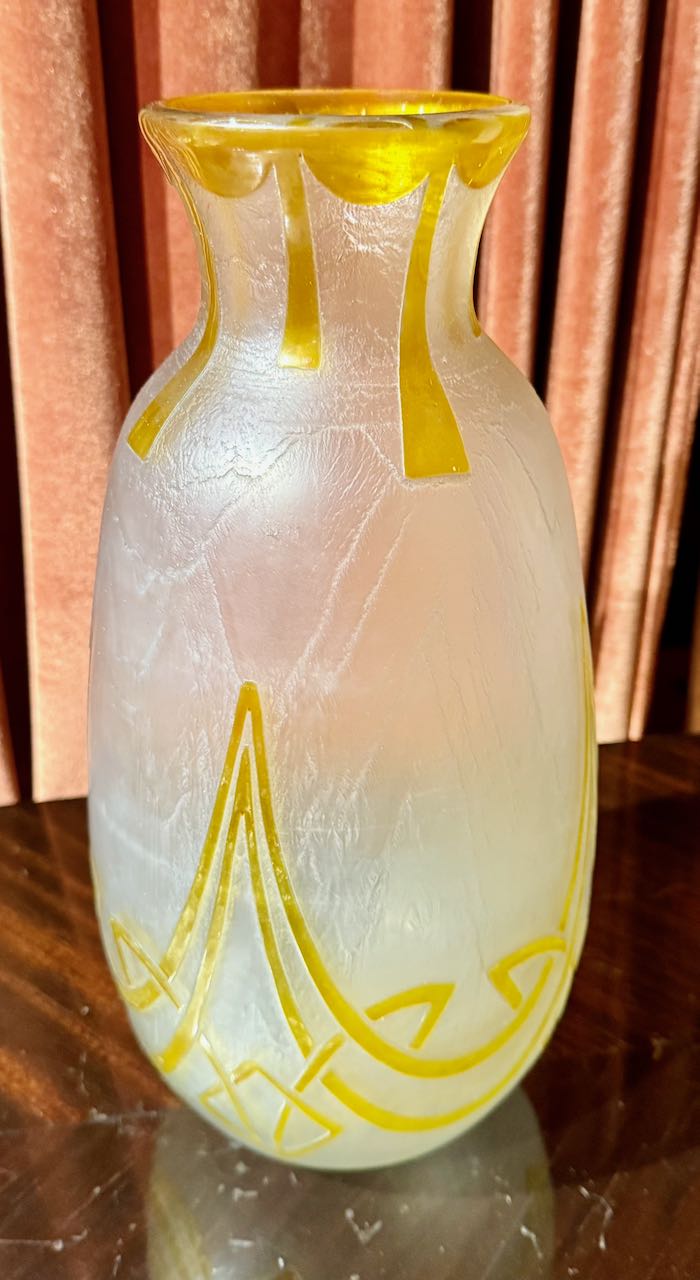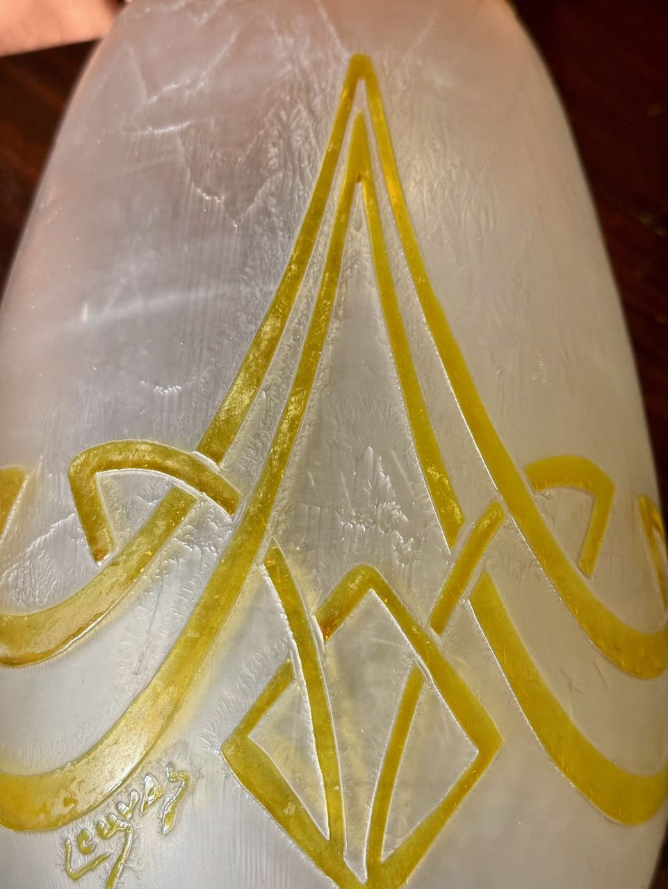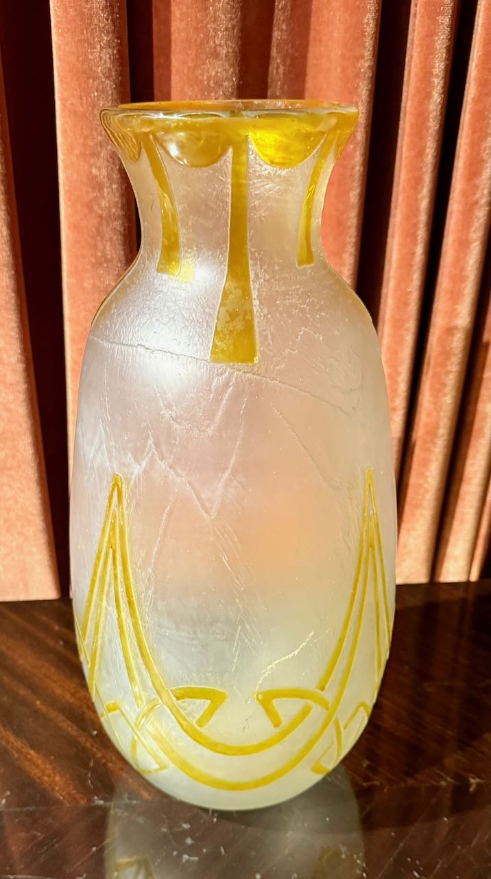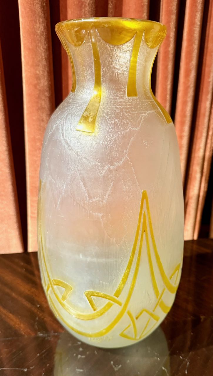 An elegant French Art Deco cameo glass vase was produced by the Legras workshops in Pantin during the late 1920s and early 1930s. It is executed in thick opaline glass, overlaid with a warm, amber-yellow casing that has been selectively cut back to form a bold, architectural, geometric design. The decoration is carved directly into the layered glass using acid and wheel finishing techniques rather than applied color, giving the surface true sculptural depth and a luminous internal glow.
