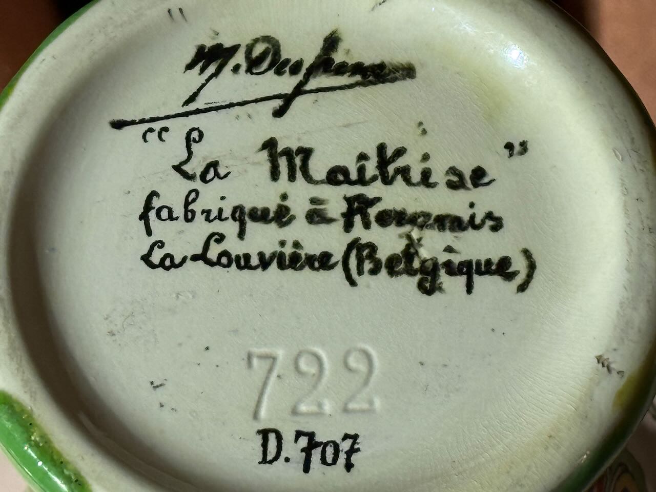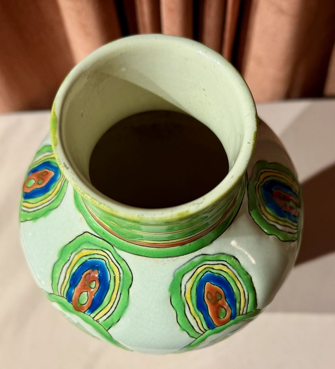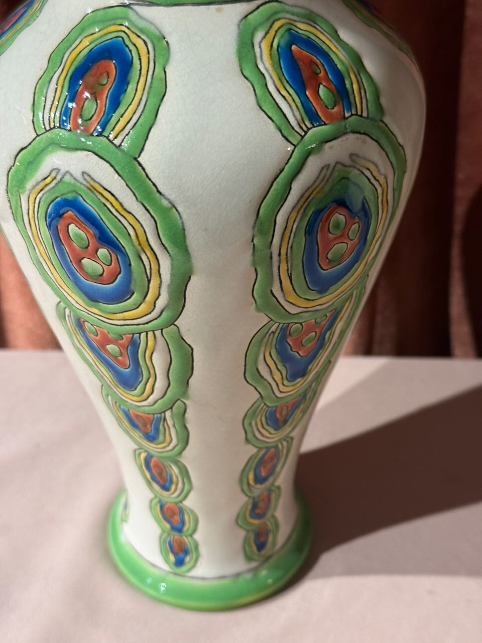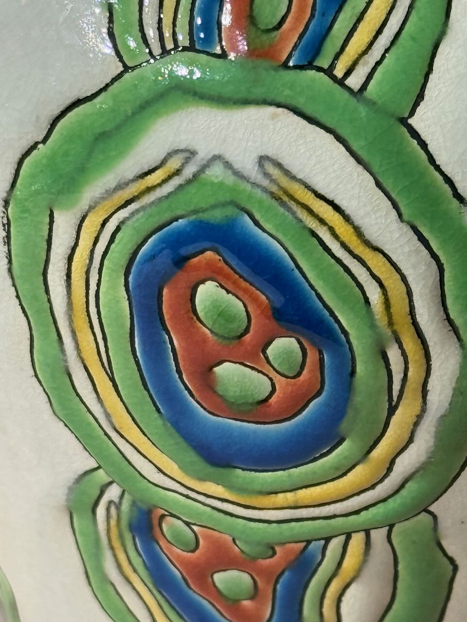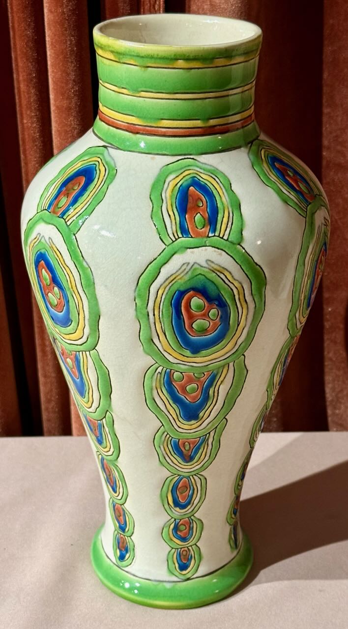 The vase was manufactured by Boch Keramis in La Louviere in Belgium and decorated in the distinctive cloisonne ceramic technique that made the workshop famous. The raised enamel lines, layered color fields and rhythmic geometric pattern show the influence of French modern design during the peak years of the Art Deco movement. Works connected to Dufrene and La Maîtrise remain especially collectible due to their beauty, craftsmanship and their direct link to one of the great Parisian design institutions of the early twentieth century. This example, in excellent condition and displays exceptional color and presence.