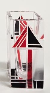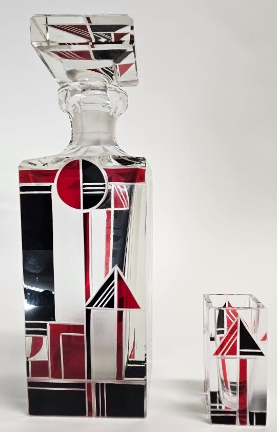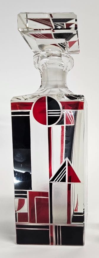 This striking vintage Czech Art Deco decanter set features an unusually bold and geometric design in clear crystal with dramatic black and red enamel accents. The architectural composition includes precise, asymmetrical arrangements of circles, triangles, and rectangles, hand-painted in a sharp palette evocative of Czech Cubism and Bauhaus influences.