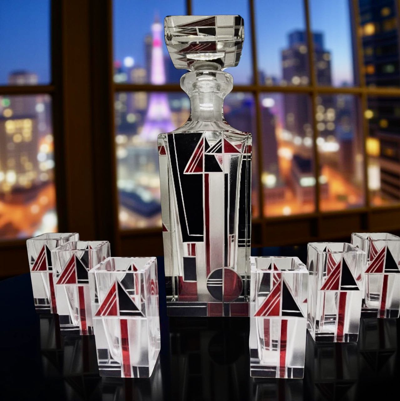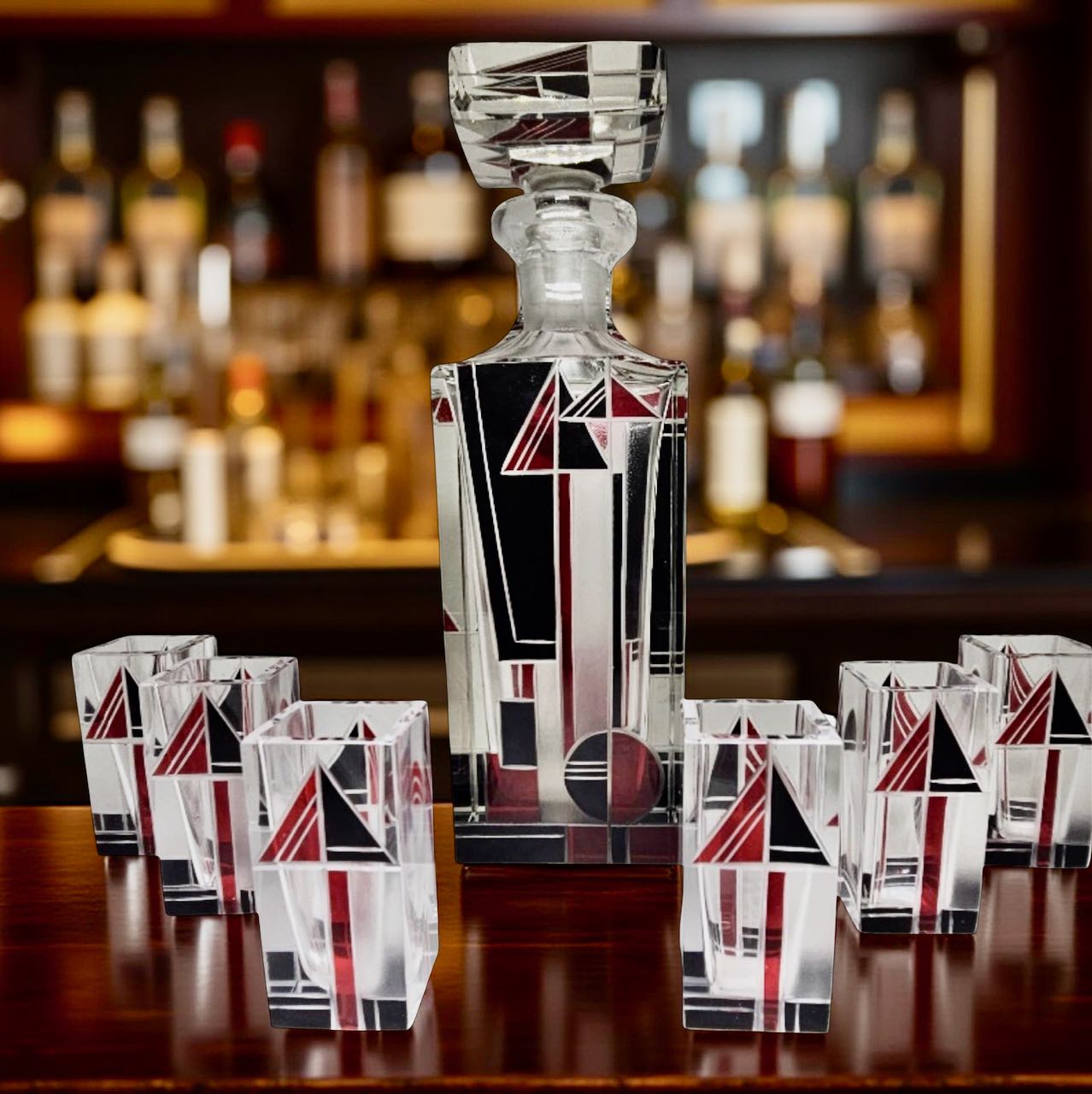 The square-form decanter, capped with a matching angular stopper, is paired with six faceted, rectangular shot glasses – all decorated in a consistent modernist style that emphasizes balance, symmetry, and dynamic contrast. The vertical and angular elements evoke the forward-looking aesthetic of the Machine Age.