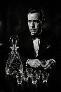 Karl Palda, one of the most celebrated Bohemian glass designers, established his workshop in Haida (Nový Bor), the glassmaking center of Czechoslovakia, where he became known for combining machine-age angular forms with artistic hand-enamel decoration. His designs were widely exported throughout Europe and beyond, symbolizing a new modern lifestyle of elegance and refinement. The matching six liqueur glasses mirror the decanter’s angular profile, with their black enamel V-shaped motifs accentuating the architectural quality of each piece. Together, the set exemplifies the meticulous craftsmanship and stylistic innovation that placed Bohemian glass at the forefront of international Art Deco design.