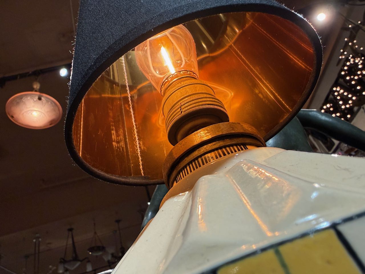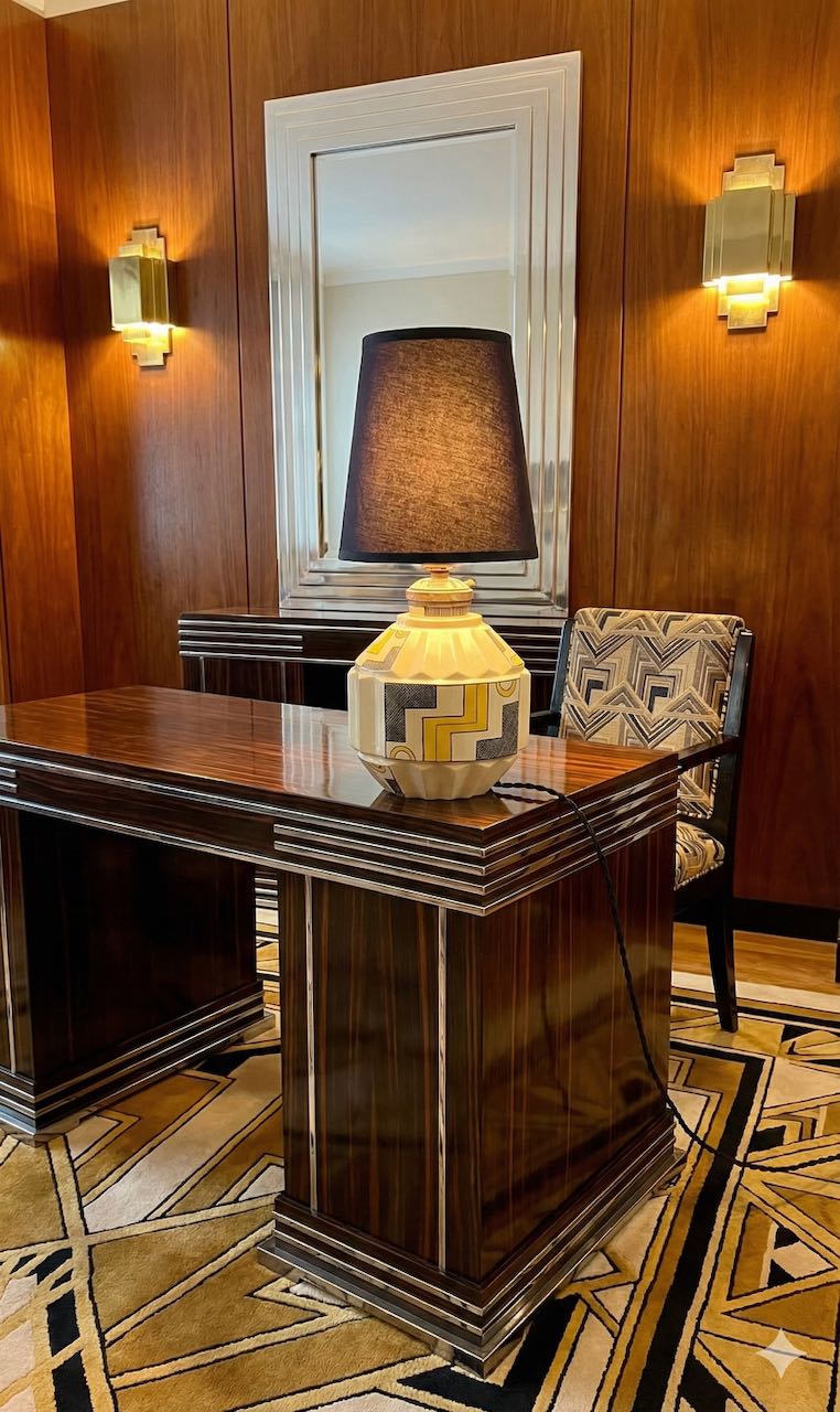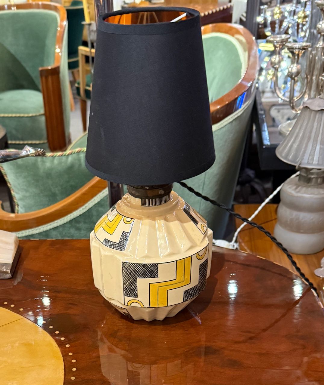 This example is signed to the underside and has been professionally rewired for safe modern use while preserving its original character. It retains its dramatic original French glass shade, which complements the lamp’s geometric body and heightens its sculptural impact. Rare in both form and decoration, this lamp stands as an important and visually commanding example of French Art Deco ceramic lighting, ideally suited for placement on a desk, console, cabinet, or nightstand where its architectural presence can be fully appreciated.