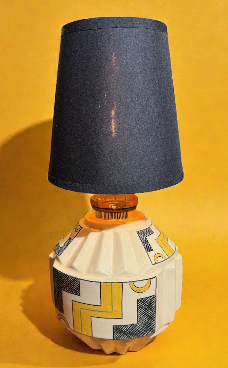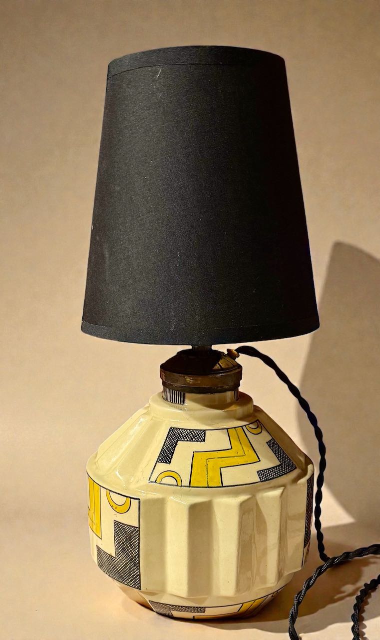 This striking ceramic table lamp represents the refined modernist vocabulary developed by Robert Lallemant during the height of the French Art Deco period. The sculptural vessel form, conceived originally as a ceramic vase, has been transformed into a dramatic illuminated object that expresses the era’s fascination with geometry, architectural relief, and stylized ornament. Its faceted cylindrical body is articulated by a bold raised center band and rhythmic sawtooth edge molding, creating a sculptural silhouette that is as compelling in daylight as it is when illuminated.