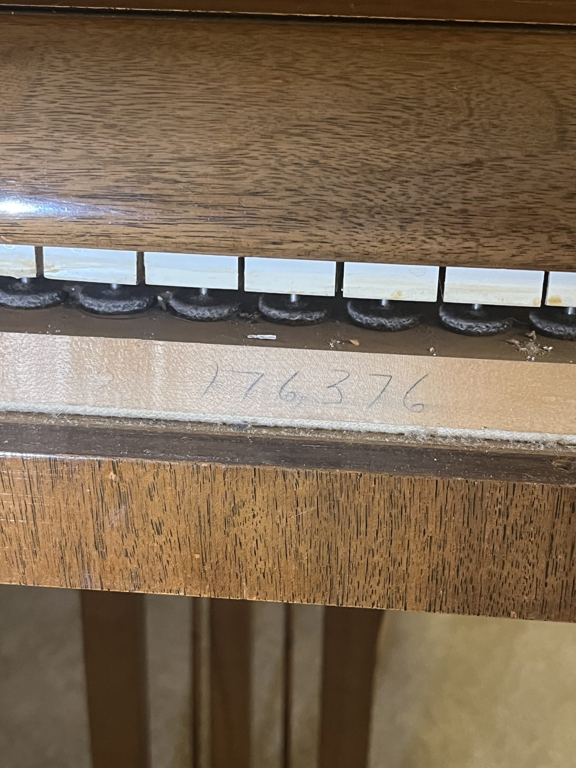 The design becomes even more impressive when the winged lids are opened, revealing a secondary removable inner lid with decorative cutouts that allow the sound to project beautifully from the cabinet. A large F hole, reminiscent of a violin, joins multiple radial sound slots along the outer edge, creating both visual drama and an acoustic function unique to this celebrated model. Of the Butterfly pianos, the Style 1411 is considered the finest and most professional version, built with the full standard 88 key keyboard rather than the smaller 73 key format also offered in other period case styles. Although no one knows the exact production number, it is believed that approximately 75 of these were manufactured in 1937, making surviving examples especially desirable. Serial number 176376 dates this piano to approximately 1937.