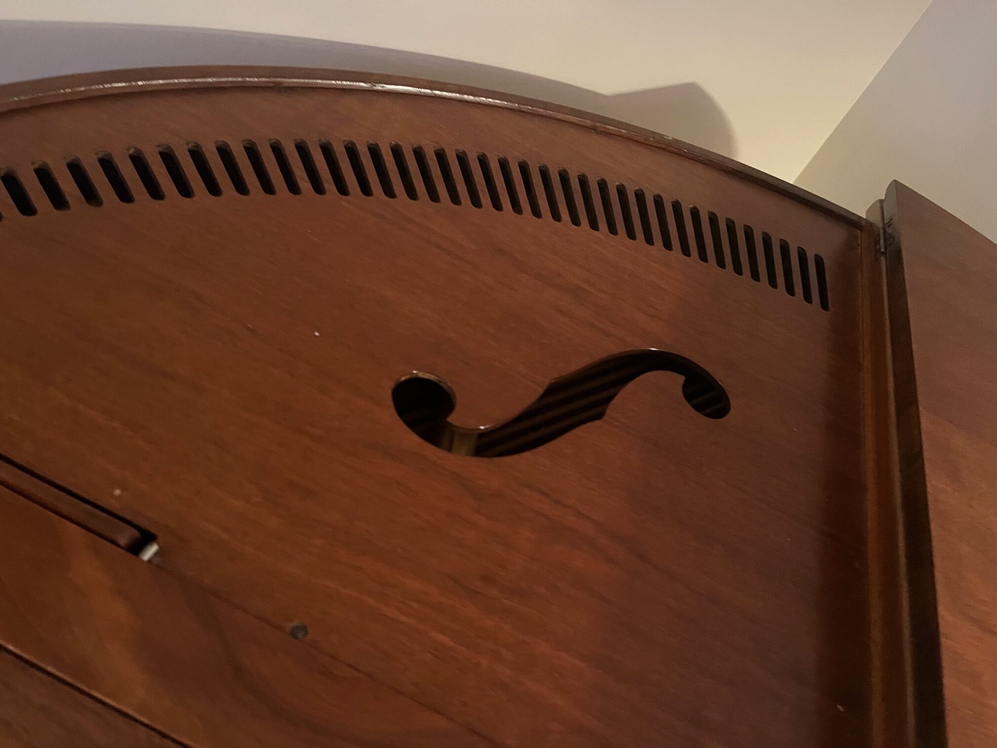 Particularly striking is the beautifully designed woodwork behind the pedals, where Wurlitzer introduced crisp Deco detailing that reinforces the piano’s unmistakable period identity. The case displays spectacular mahogany with deep warmth, handsome grain, and a rich surface that gives the instrument remarkable presence even before a note is played.