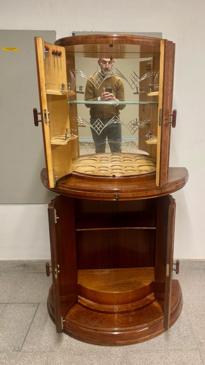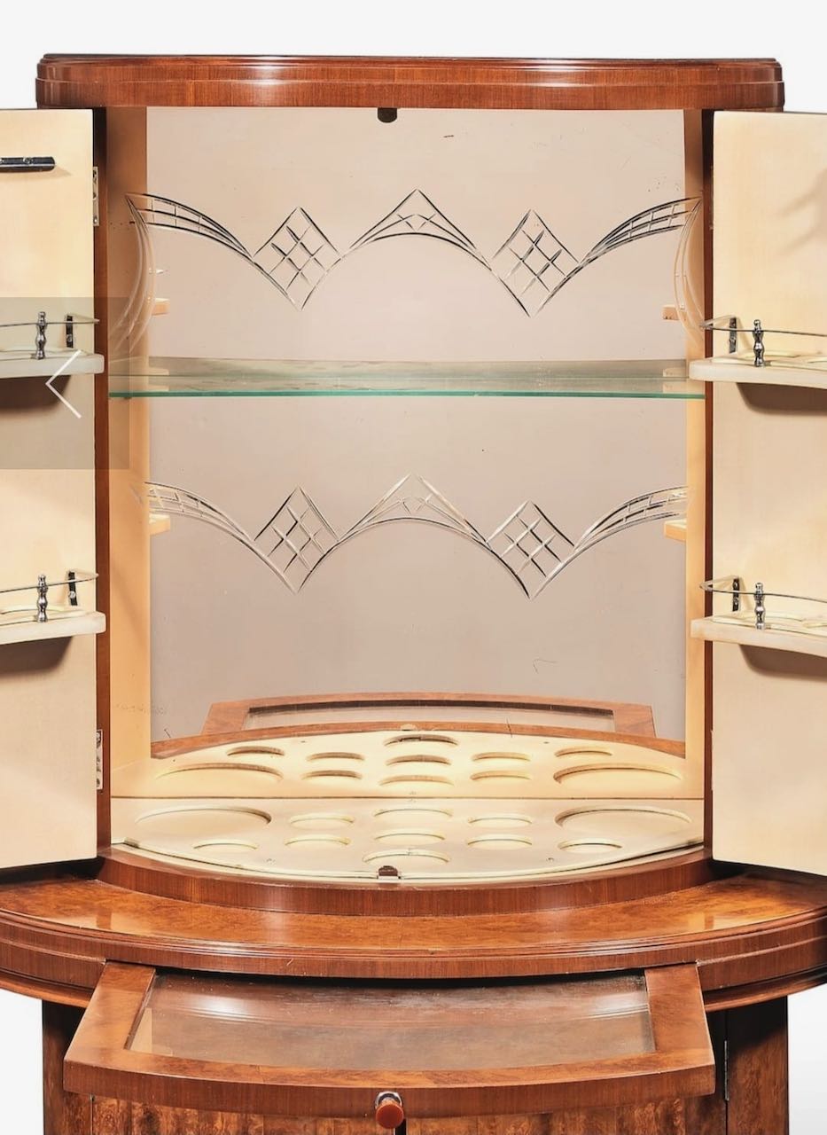 The cabinet is divided into an upper and lower compartment, each concealed behind finely fitted curved doors with original hardware. When opened, these cabinets traditionally reveal pale sycamore interiors with mirrored back panels and fitted shelving designed to hold cocktail glasses, decanters and bar accessories. This contrast between the warm walnut exterior and the light interior woods was a hallmark of Epstein production, emphasizing clarity, cleanliness and modernity within the Art Deco aesthetic. The form and construction demonstrate a high level of cabinetmaking skill, with precision veneering, carefully matched grain and seamless curvature throughout the piece.