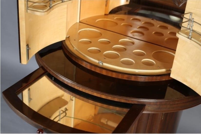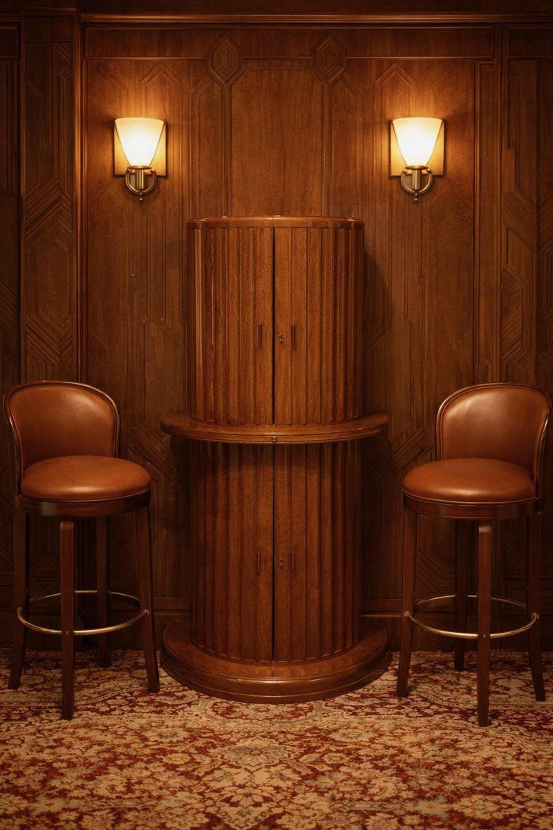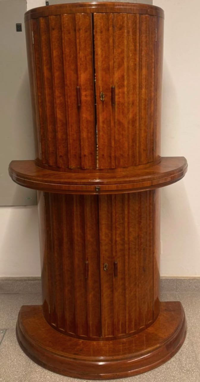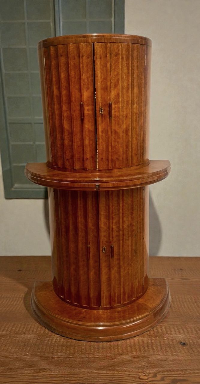 This commanding Art Deco cocktail cabinet is a distinguished example of English luxury furniture from the early nineteen thirties, attributed to the celebrated firm of Harry and Lou Epstein. The cabinet presents a dramatic cylindrical form executed in richly figured burr walnut veneer, carefully selected for its deep flame pattern and natural movement. The vertical fluting that wraps the entire body creates a powerful architectural rhythm, giving the piece both sculptural presence and refined elegance. The stepped base and central projecting serving ledge reinforce its monumental silhouette while maintaining a balanced and highly functional design intended for sophisticated entertaining.