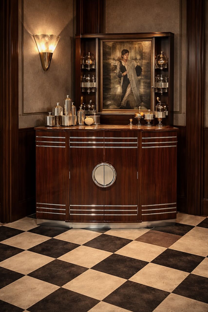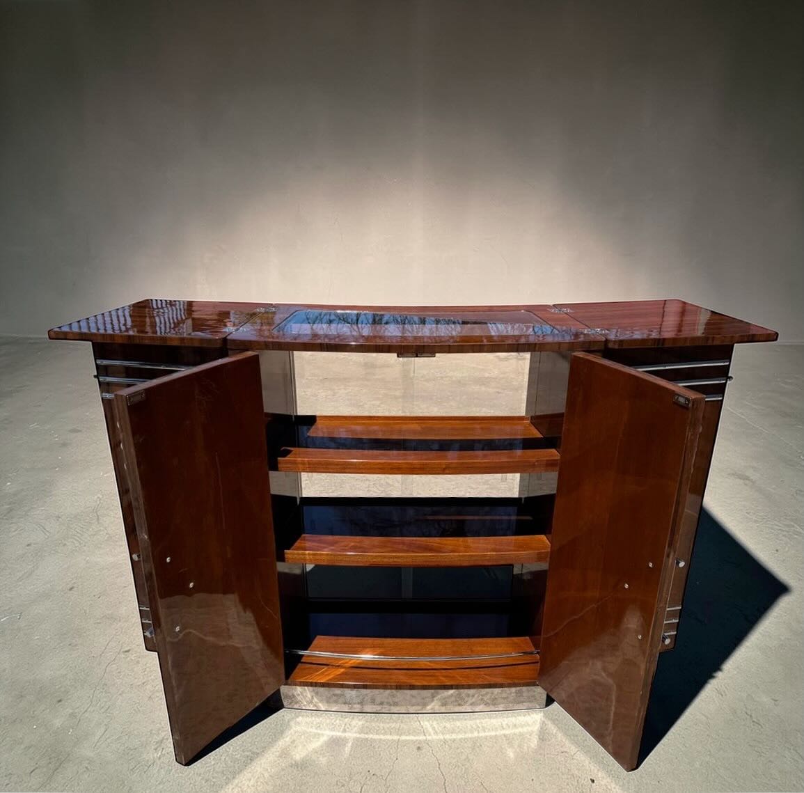 Crafted from sumptuously flamed walnut with a lustrous hand polished finish, the cabinet displays rich movement across its façade, enhanced by bold chrome speed lines that define its streamlined silhouette. Newly added polished metal accents elevate the design further, complementing the original interior bar fittings and accessories. The result is a rare fusion of English craftsmanship and Art Deco modernity.