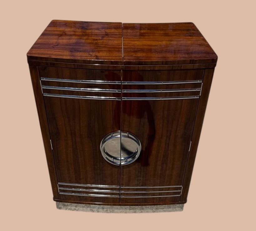 English Art Deco Yacht Flip Top Bar in Flamed Walnut
