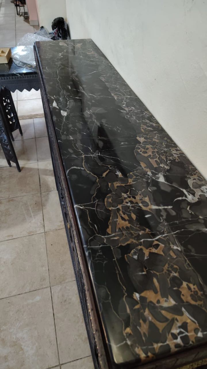 This exceptional, handmade iron console is a unique, one-of-a-kind work, custom-made exclusively for us and conceived as a true statement piece rather than a decorative accessory. Crafted in the finest French style fer forgé tradition, the ironwork displays a remarkable level of precision and artistry, combining strong architectural geometry with elegant ornamental detailing. Every element was forged by hand, resulting in a sculptural presence that reflects both craftsmanship and artistic intent, qualities rarely found in contemporary ironwork. The console is crowned with a slab of the finest Portoro marble and hand touched gilded patina.