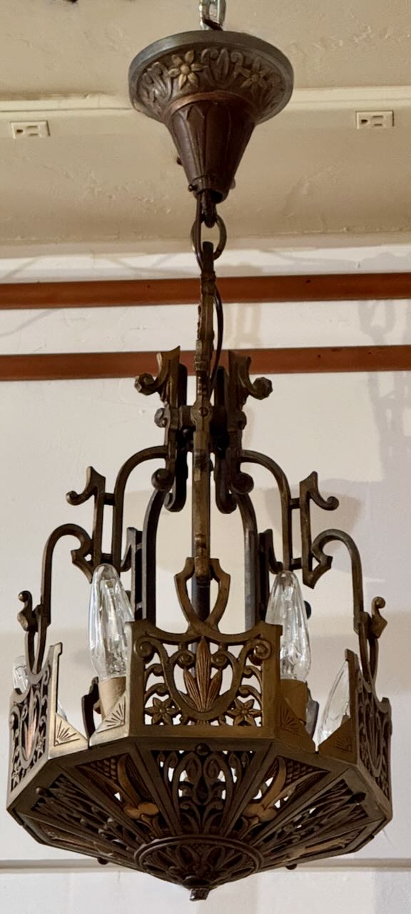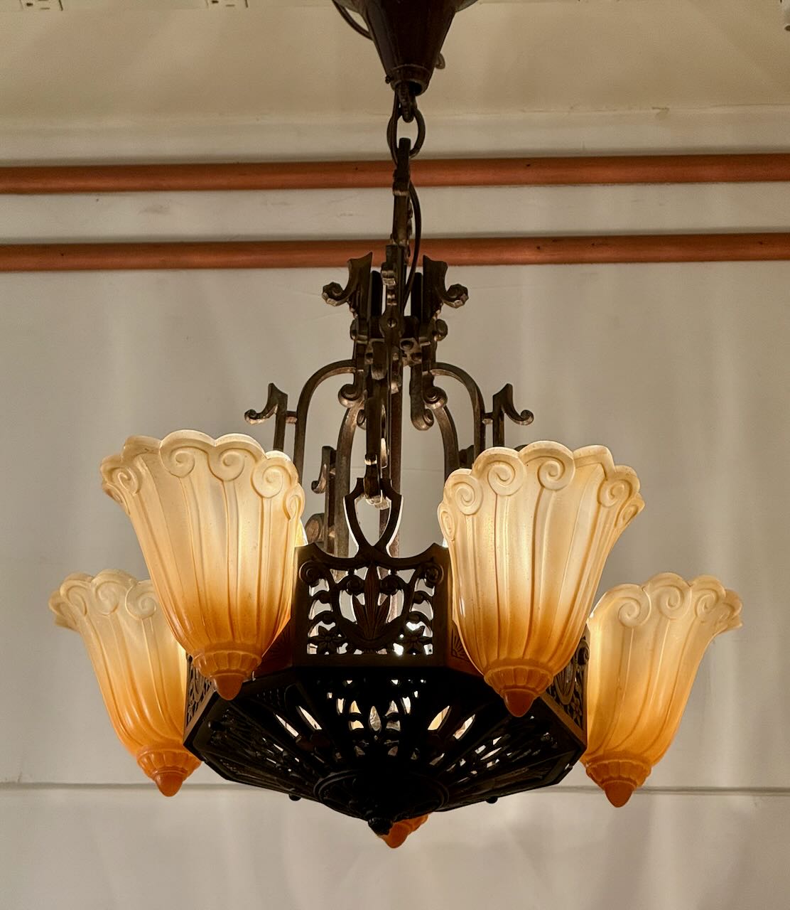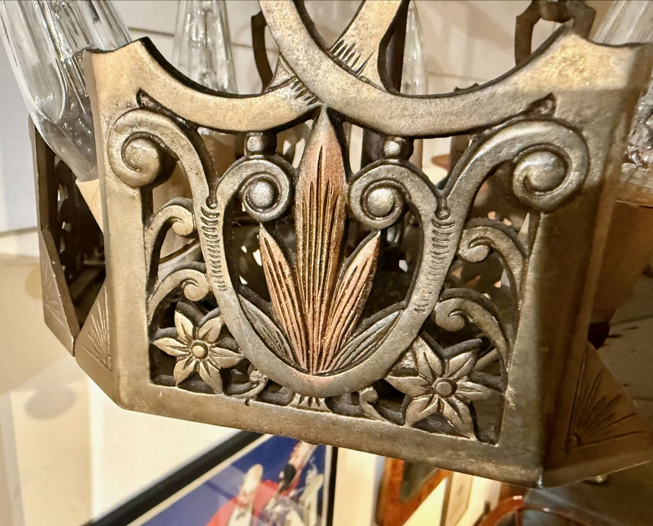 This striking Art Deco chandelier captures the essence of the period through its bold architectural presence and refined craftsmanship. The fixture is anchored by a deeply cast bronze structure, rich in tone and detail, with a sculptural framework that rises with confidence and balance. Its form reflects the transition from traditional ornament to the more stylized and geometric language that defined the Art Deco movement. The symmetry and vertical lift of the design create a strong visual anchor, making it ideal as a centerpiece above a dining table or in an entry hall where atmosphere and statement are equally important.