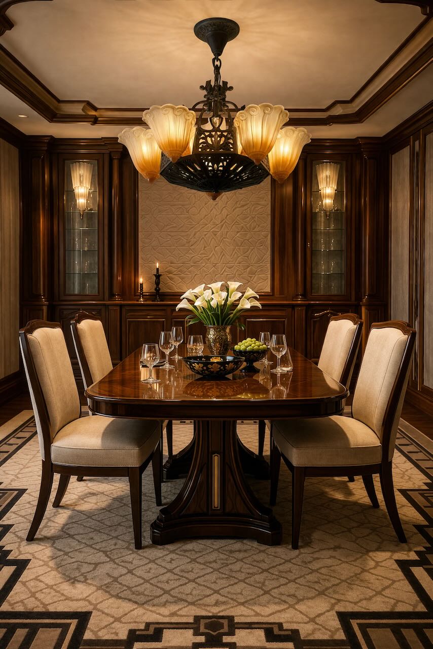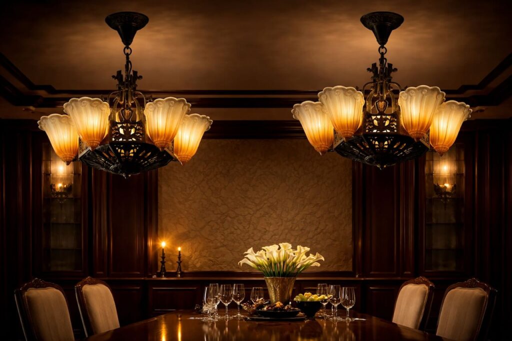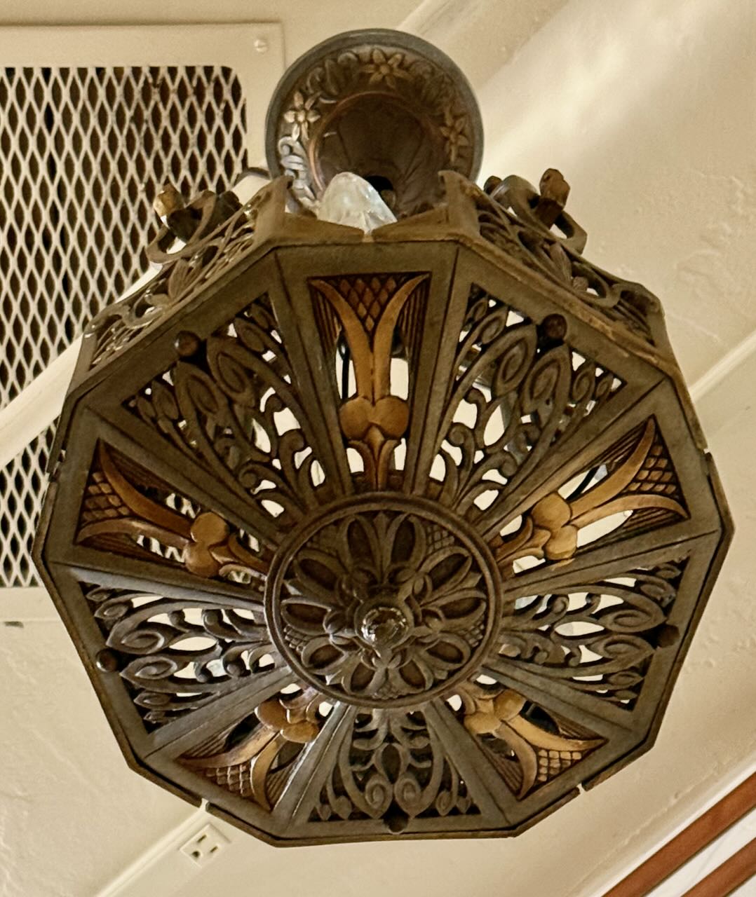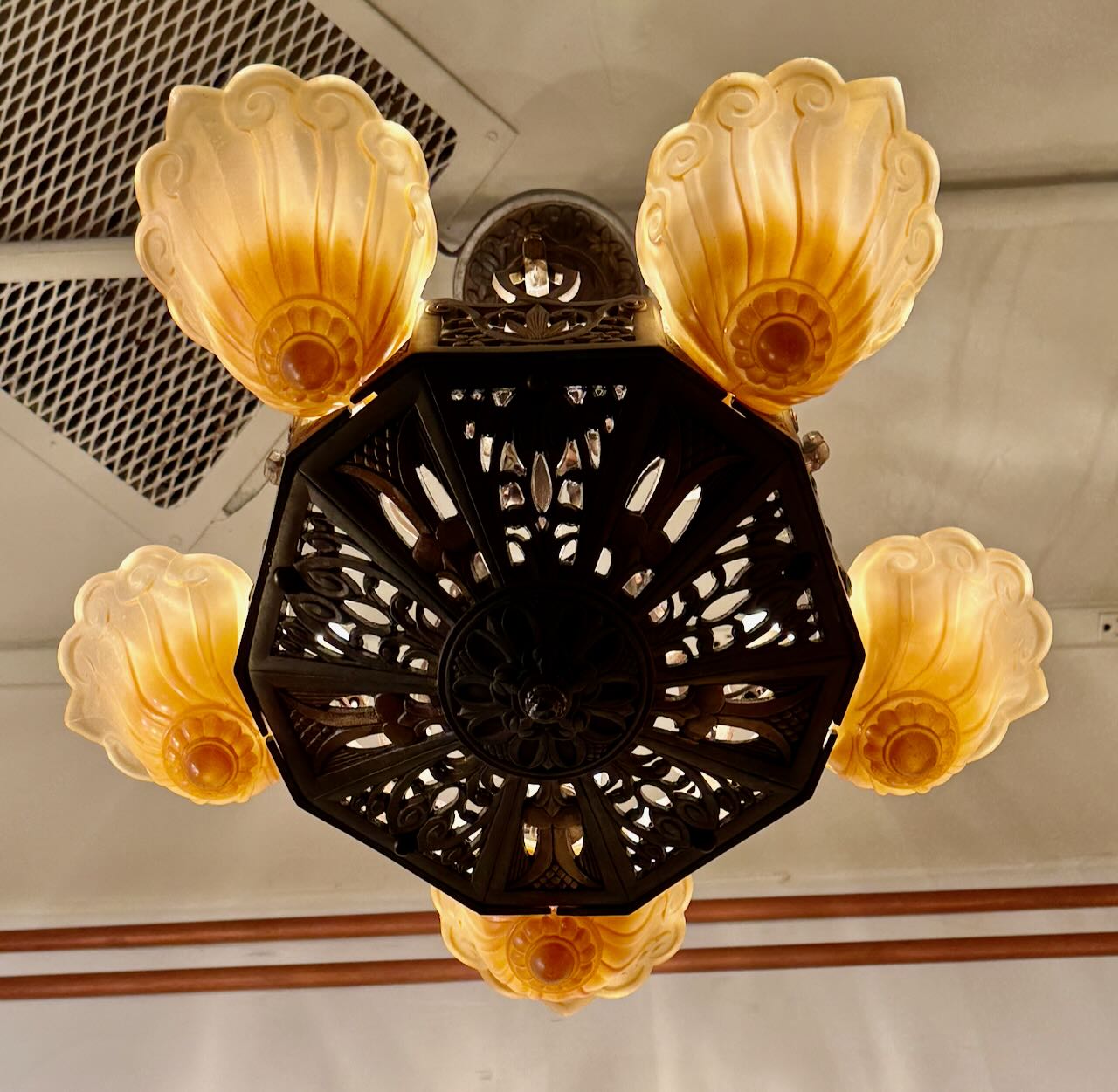 This striking Art Deco chandelier captures the essence of the period through its bold architectural presence and refined craftsmanship. The fixture is anchored by a deeply cast bronze structure, rich in tone and detail, with a sculptural framework that rises with confidence and balance. Its form reflects the transition from traditional ornament to the more stylized and geometric language that defined the Art Deco movement. The symmetry and vertical lift of the design create a strong visual anchor, making it ideal as a centerpiece above a dining table or in an entry hall where atmosphere and statement are equally important.