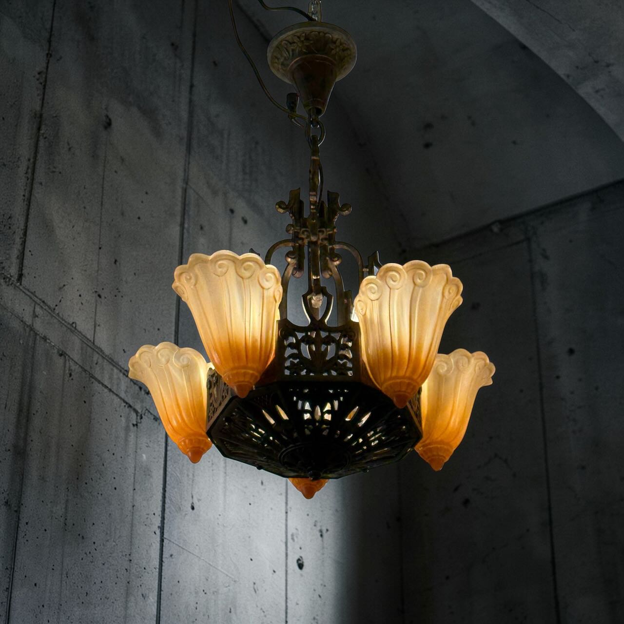 Art Deco Bronze and Amber Glass Chandelier with Sculptural Form