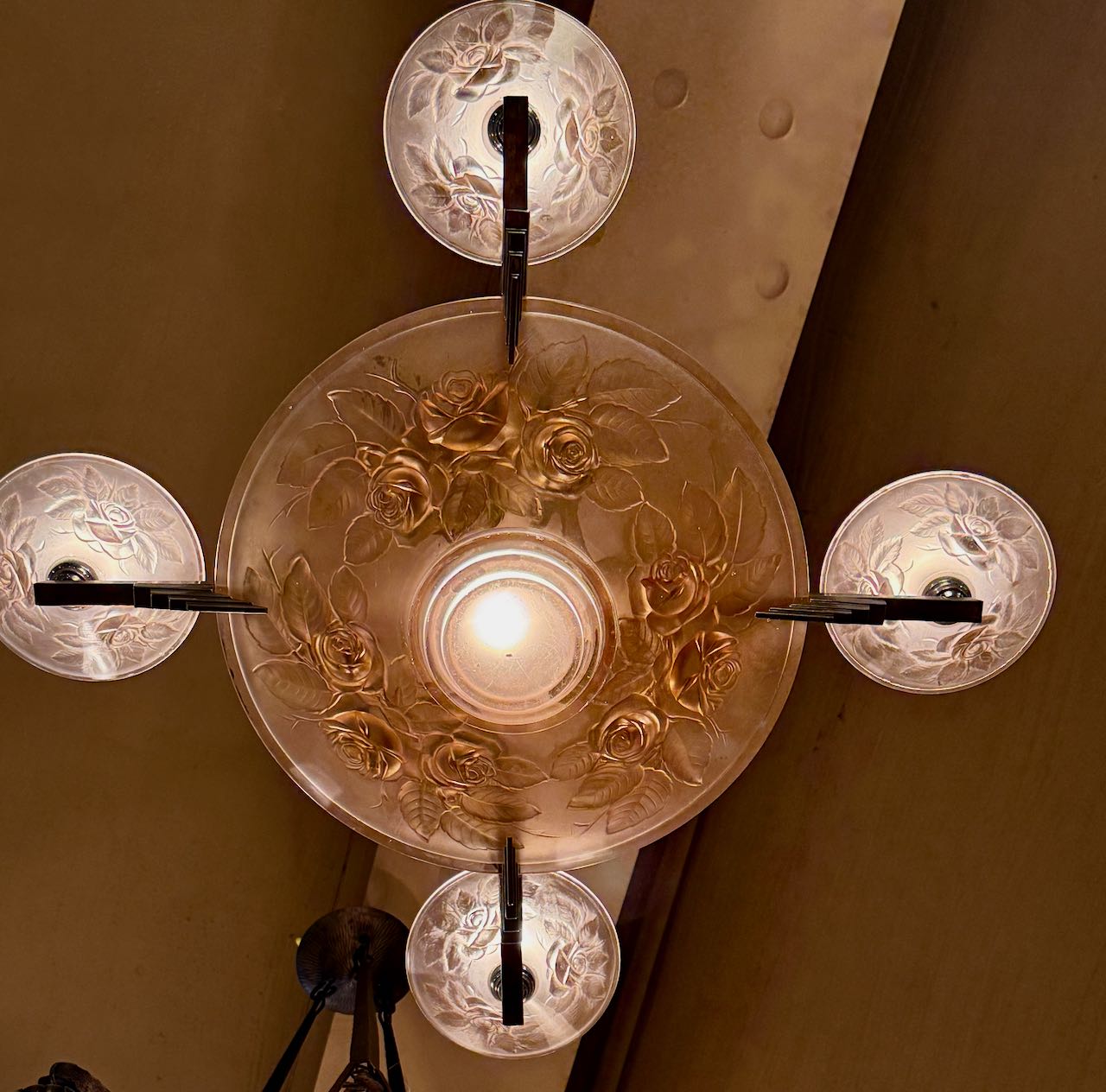 Each pink glass is among the rarer colorations produced by Muller Frères, making this chandelier particularly desirable to collectors and connoisseurs. Its floral decoration, executed with crisp detail, reflects both the naturalistic inspiration and the modernist lines of Art Deco lighting. With its original nickel-plated frame and signed glass shades, this chandelier is a distinguished example of French decorative arts from the 1930s.