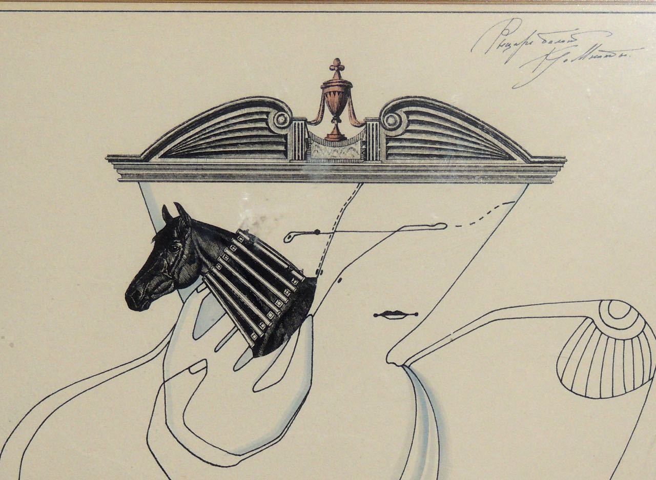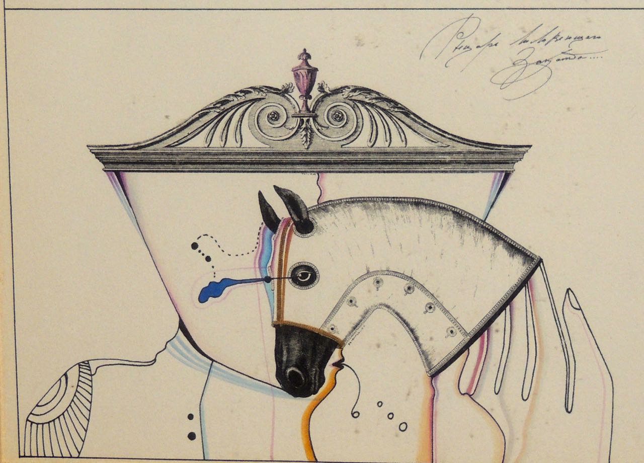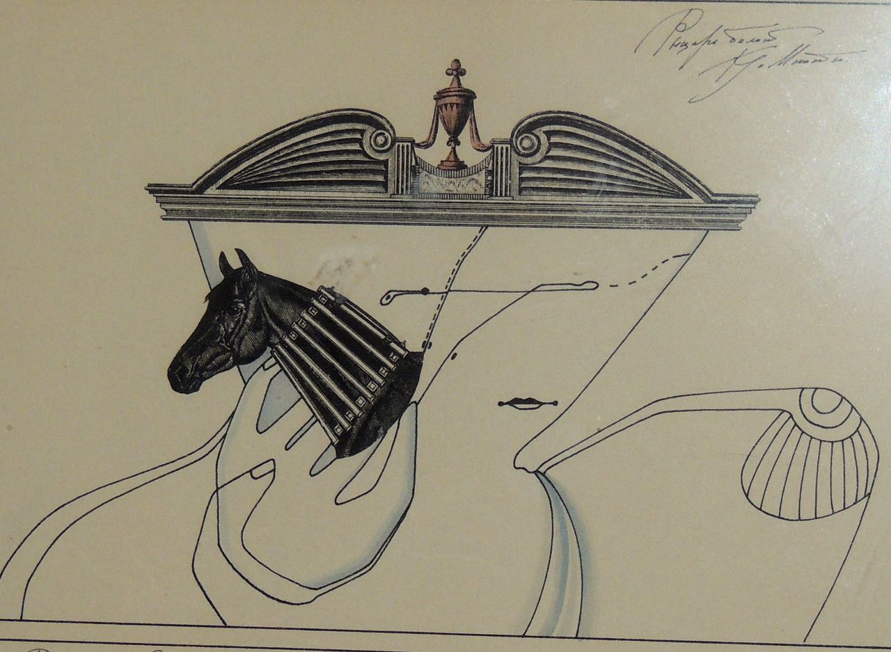 A complex and richly detailed original drawing by Mihail Chemiakin, this rare piece showcases his unmistakable surrealist style and inventive imagination. Circa 1979, rendered in pen and ink with delicate color accents, the work is divided into four distinct yet thematically linked panels. Each scene features a "metaphysical" horse, whose stylized forms blend human, architectural, and equestrian elements into a dreamlike, almost theatrical composition. Crowned pediments and ornamental motifs adorn each figure, merging the visual language of classical architecture with Chemiakin’s metaphysical reinterpretations.