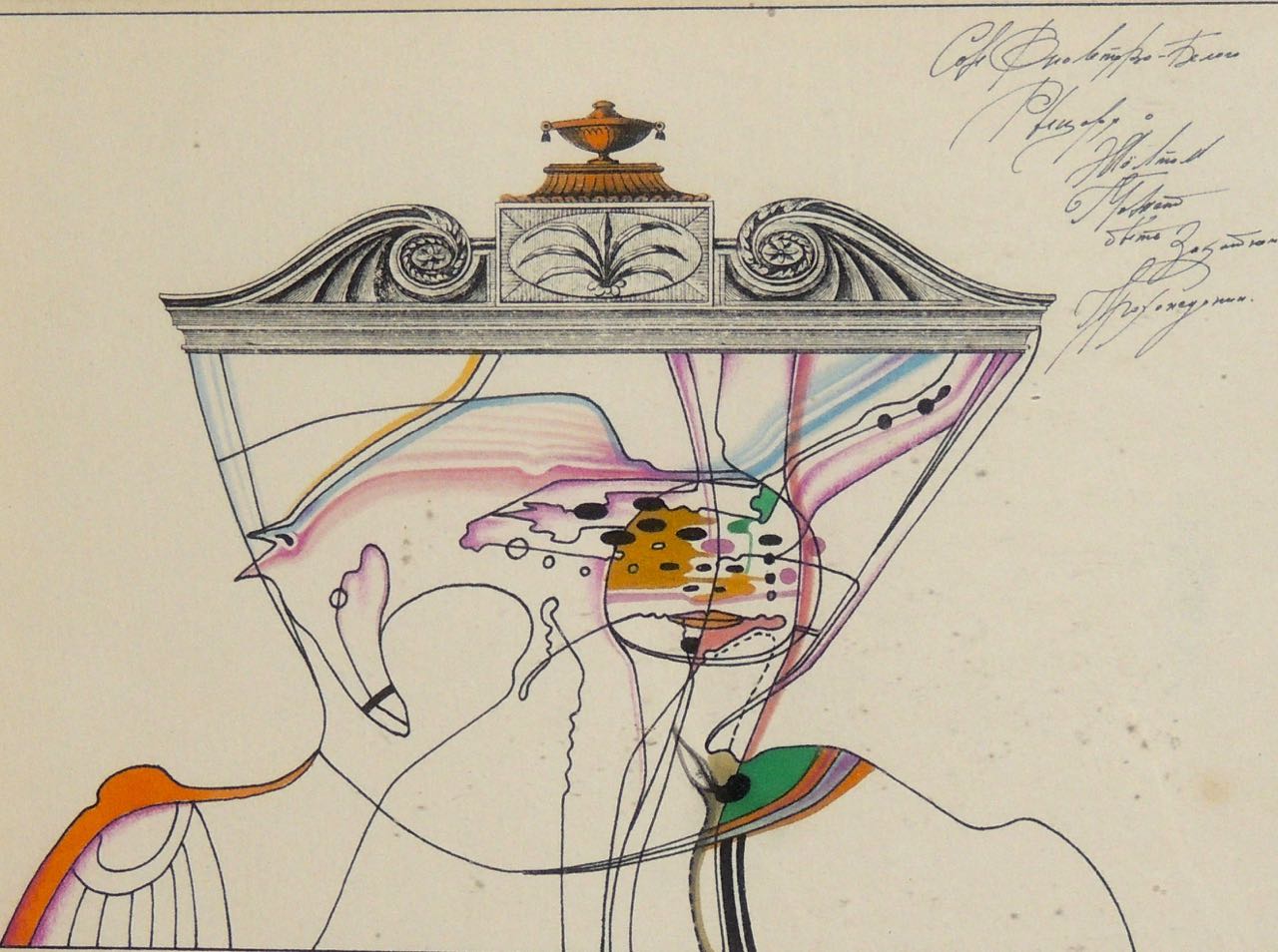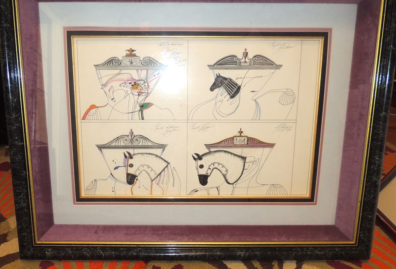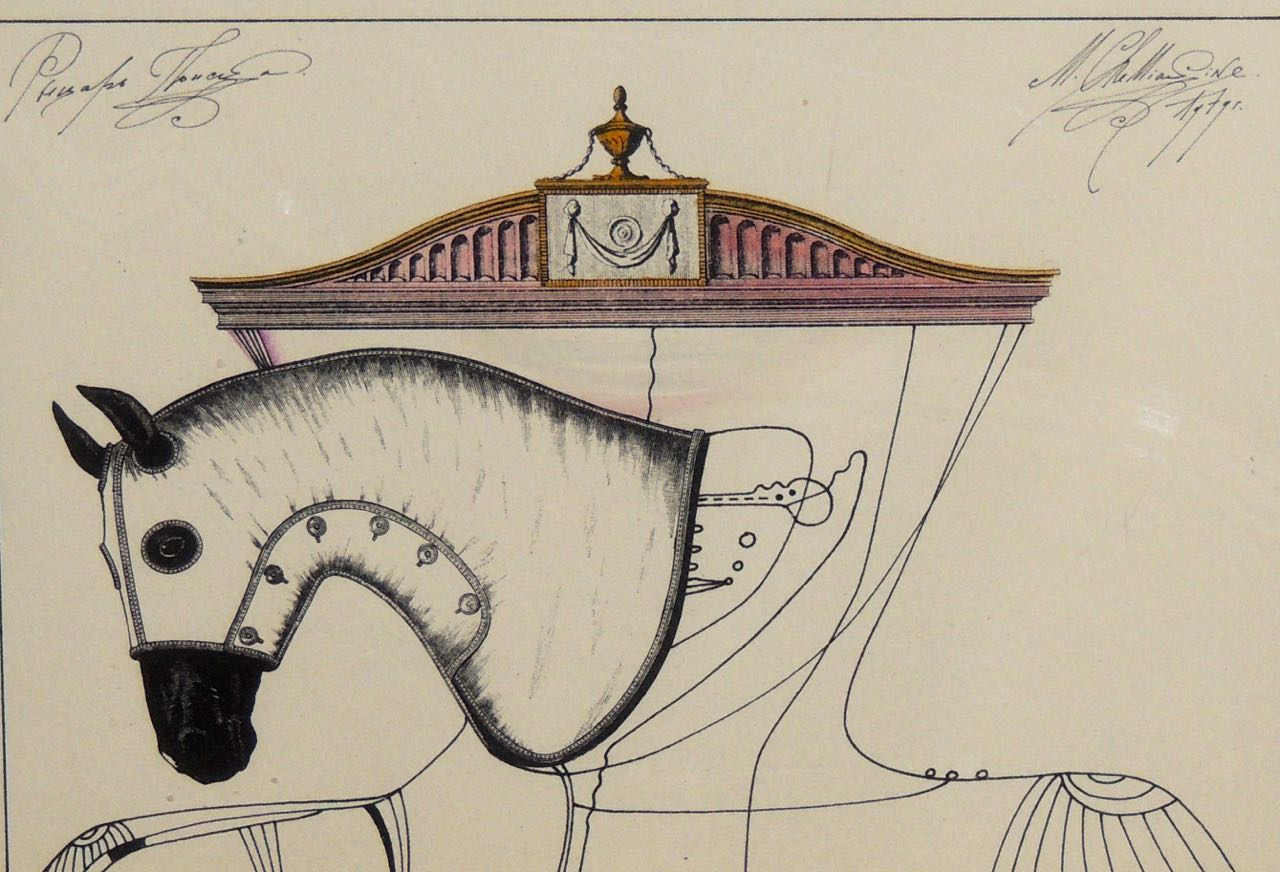 A complex and richly detailed original drawing by Mihail Chemiakin, this rare piece showcases his unmistakable surrealist style and inventive imagination. Circa 1979, rendered in pen and ink with delicate color accents, the work is divided into four distinct yet thematically linked panels. Each scene features a "metaphysical" horse, whose stylized forms blend human, architectural, and equestrian elements into a dreamlike, almost theatrical composition. Crowned pediments and ornamental motifs adorn each figure, merging the visual language of classical architecture with Chemiakin’s metaphysical reinterpretations.